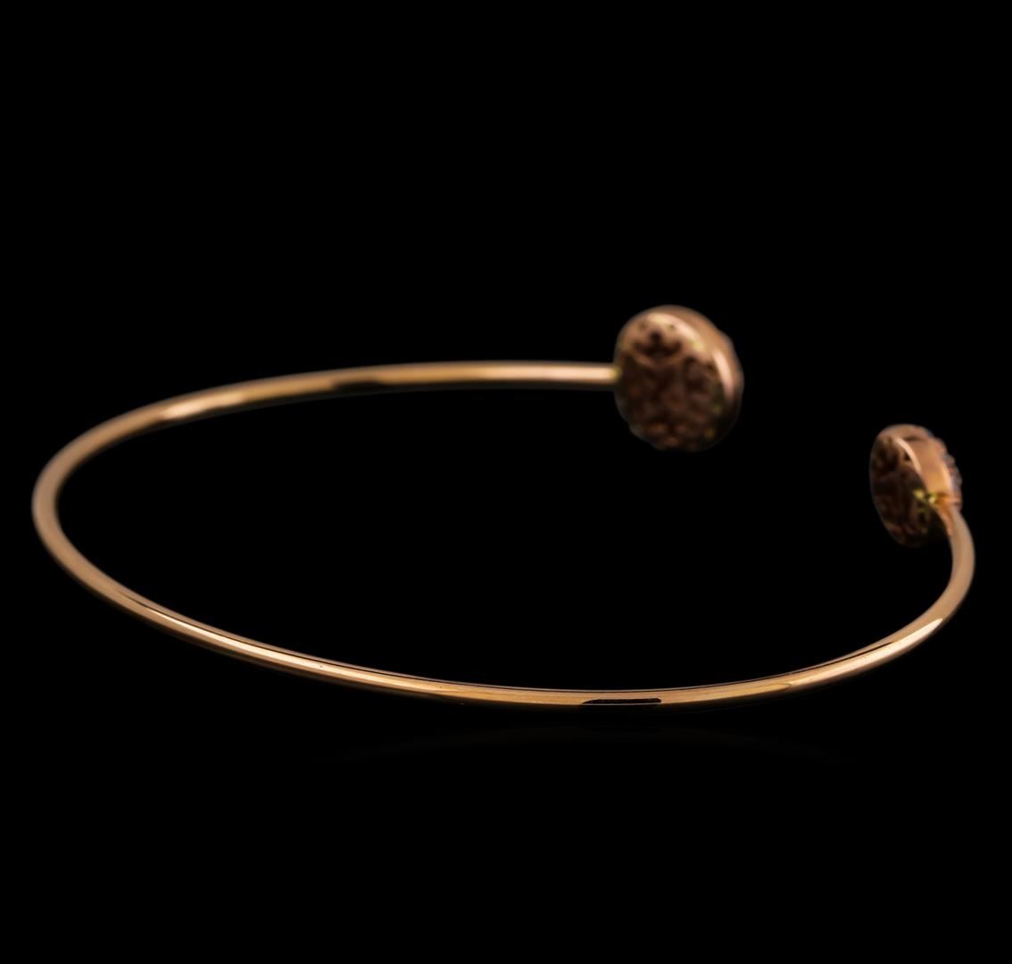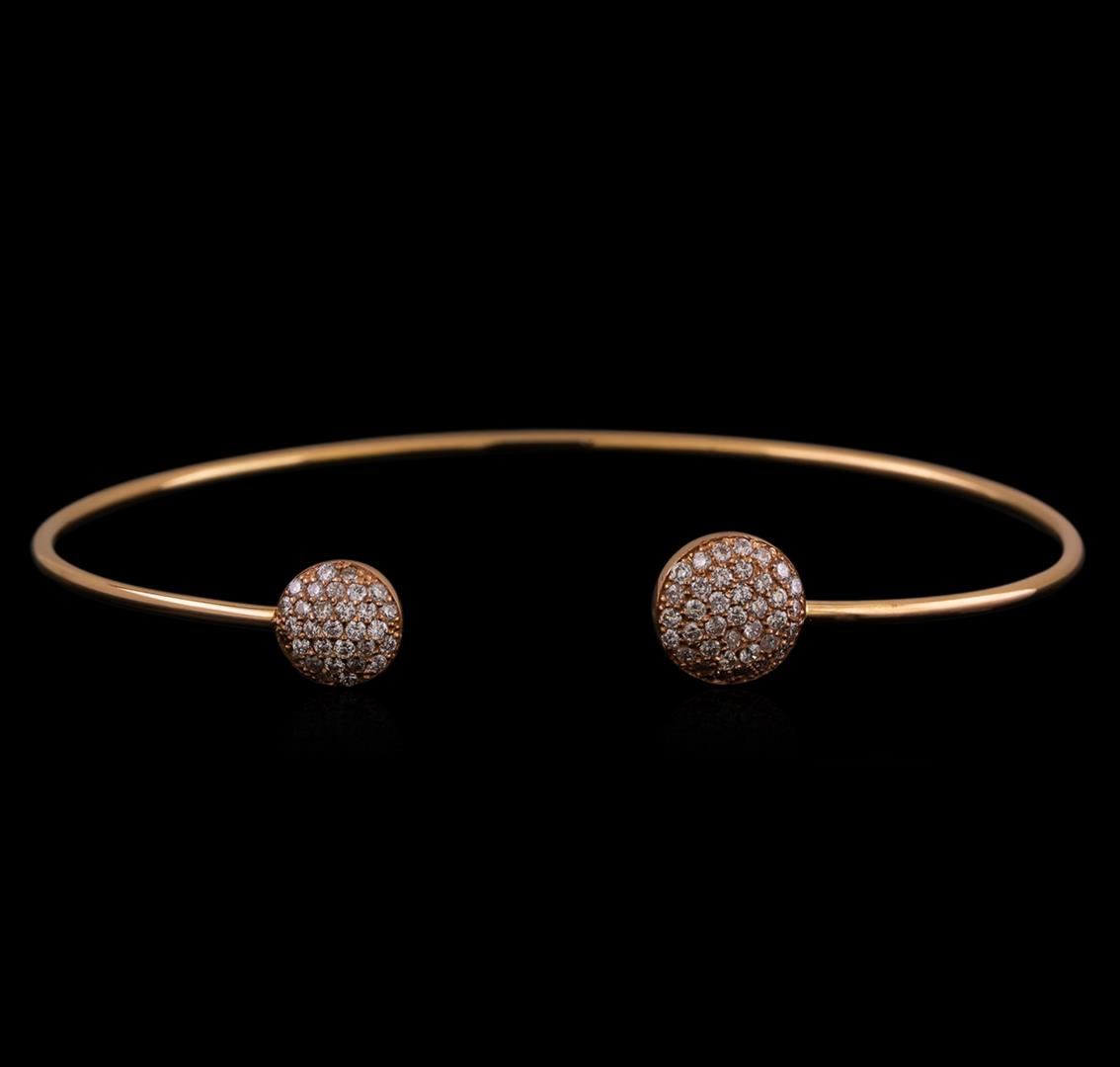 One electronically tested 14KT rose gold ladies cast diamond bangle bracelet with a bright polish finish. Condition is new. Containing: Sixty-Eight prong set round brilliant cut diamonds, measuring 1.30 - 1.30 x 0.78mm (depth est.) approximate total weight of 68 Stones = 0.54ct. Clarity: SI-1 to I-1. Color: I - J, Cut is Good. All diamonds are graded in the mounting, unless otherwise stated. Total Weight of Diamonds 0.54ct. Total Weight of Bangle Bracelet 5.20 grams. GGL Appraised at $3,140.00.