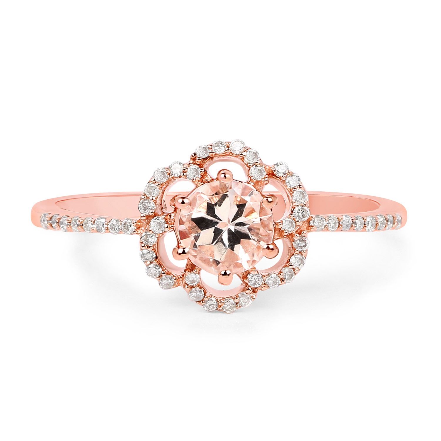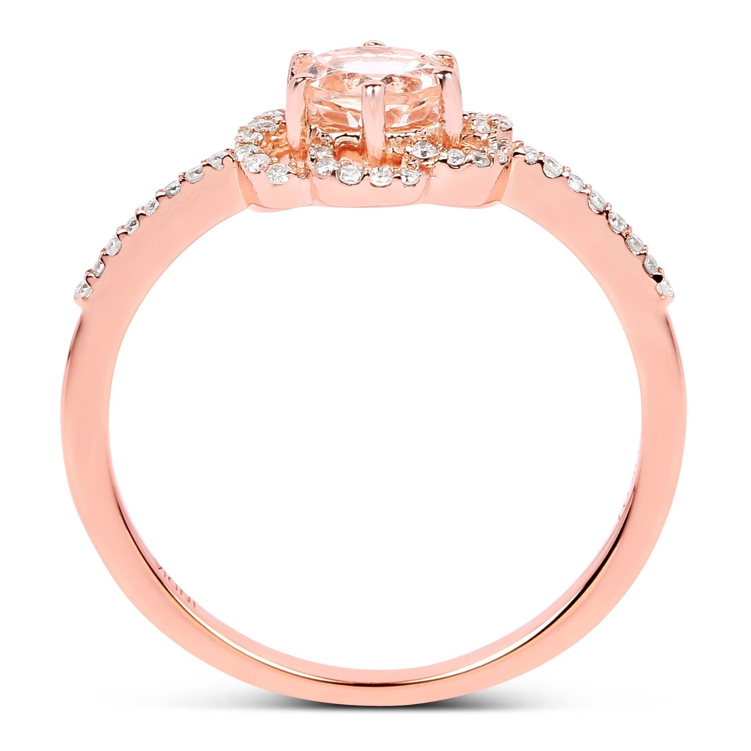 Morganite Round/5.00mm - 1/0.41 ctw Prong Setting Natural Irradiated E + White Diamond Round/0.80mm - 46/0.13 ctw Natural Not Treated N H-I I1. Ring size 7. Total weight of 2.01 grams.