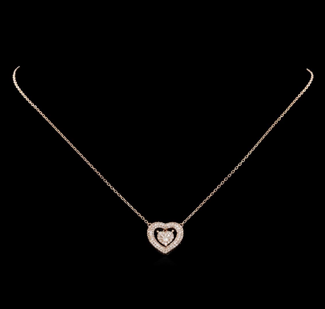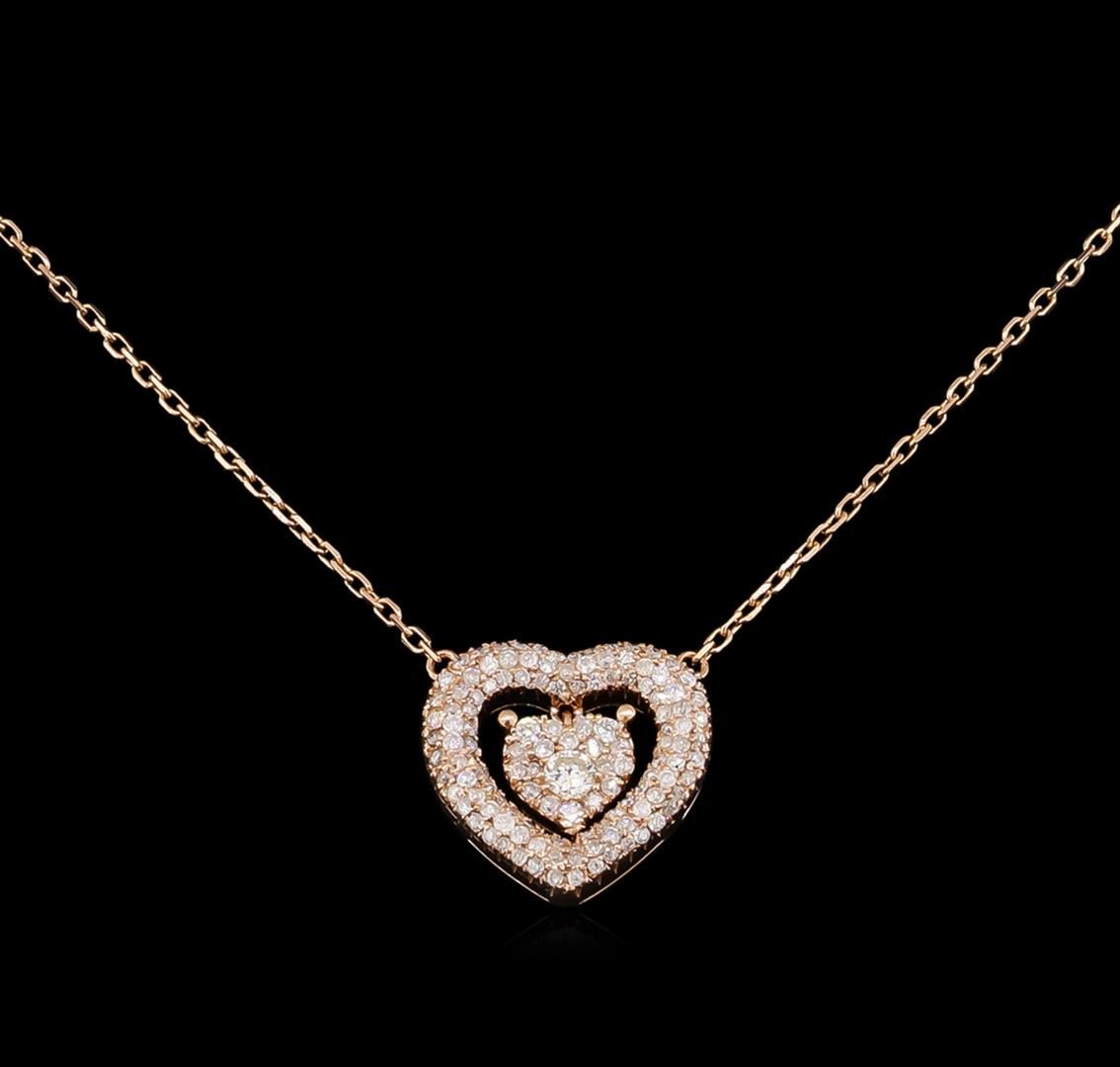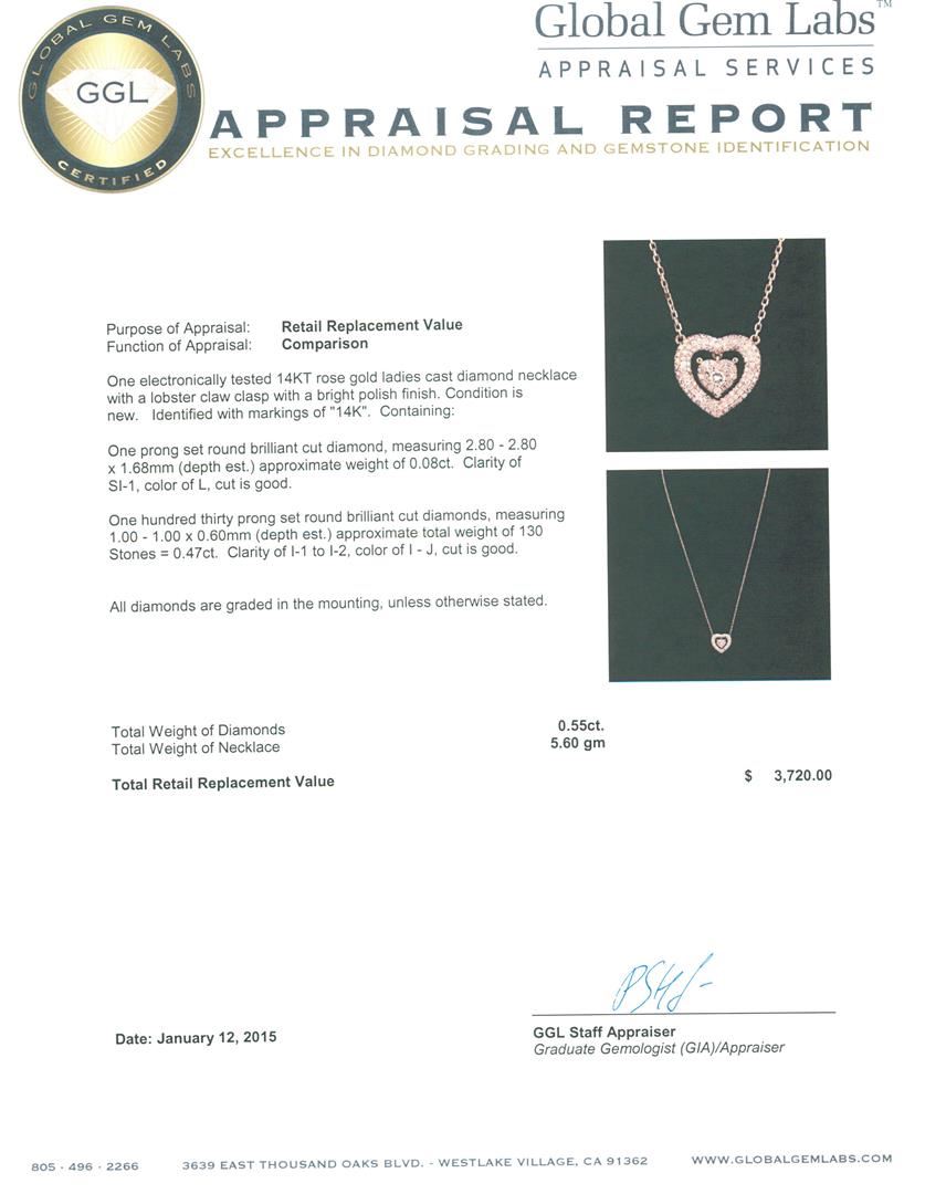 One electronically tested 14KT rose gold ladies cast diamond necklace with a lobster claw clasp with a bright polish finish. Identified with markings of "14K". Condition is new. Containing: One prong set round brilliant cut diamond, measuring 2.80 - 2.80 x 1.68mm (depth est.) approximate weight of 0.08ct. Clarity: SI-1. Color: L, Cut is Good. One Hundred Thirty prong set round brilliant cut diamonds, measuring 1.00 - 1.00 x 0.60mm (depth est.) approximate total weight of 130 Stones = 0.47ct. Clarity: I-1 to I-2. Color: I - J, Cut is Good. All diamonds are graded in the mounting, unless otherwise stated. Total Weight of Diamonds 0.55ct. Total Weight of Necklace 5.60 grams. GGL Appraised at $3,720.00.