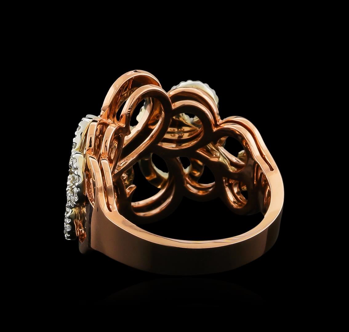 One electronically tested 14KT rose gold ladies combination cast & assembled ring with a bright polish finish. Identified with markings of "14K". Condition is new. Containing: Seventy-Eight prong set round brilliant cut diamonds, measuring 1.30 - 1.30 x 0.78mm (depth est.) approximate total weight of 78 Stones = 0.62ct. Clarity: I-1 to I-2. Color: I - J, Cut is Good. All diamonds are graded in the mounting, unless otherwise stated. Total Weight of Diamonds 0.62ct. Total Weight of Ring 9.80 grams. GGL Appraised.