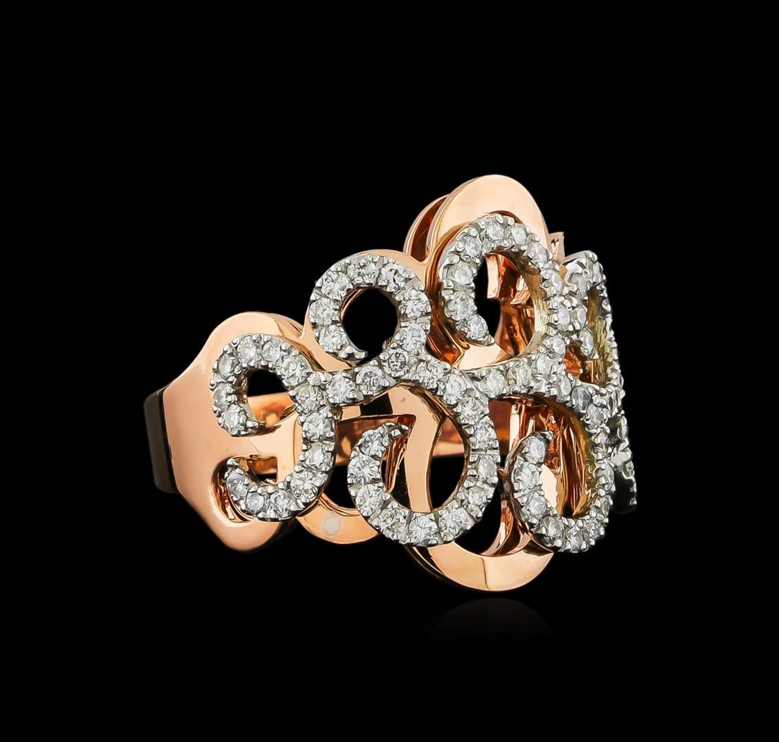 One electronically tested 14KT rose gold ladies combination cast & assembled ring with a bright polish finish. Identified with markings of "14K". Condition is new. Containing: Seventy-Eight prong set round brilliant cut diamonds, measuring 1.30 - 1.30 x 0.78mm (depth est.) approximate total weight of 78 Stones = 0.62ct. Clarity: I-1 to I-2. Color: I - J, Cut is Good. All diamonds are graded in the mounting, unless otherwise stated. Total Weight of Diamonds 0.62ct. Total Weight of Ring 9.80 grams. GGL Appraised.
