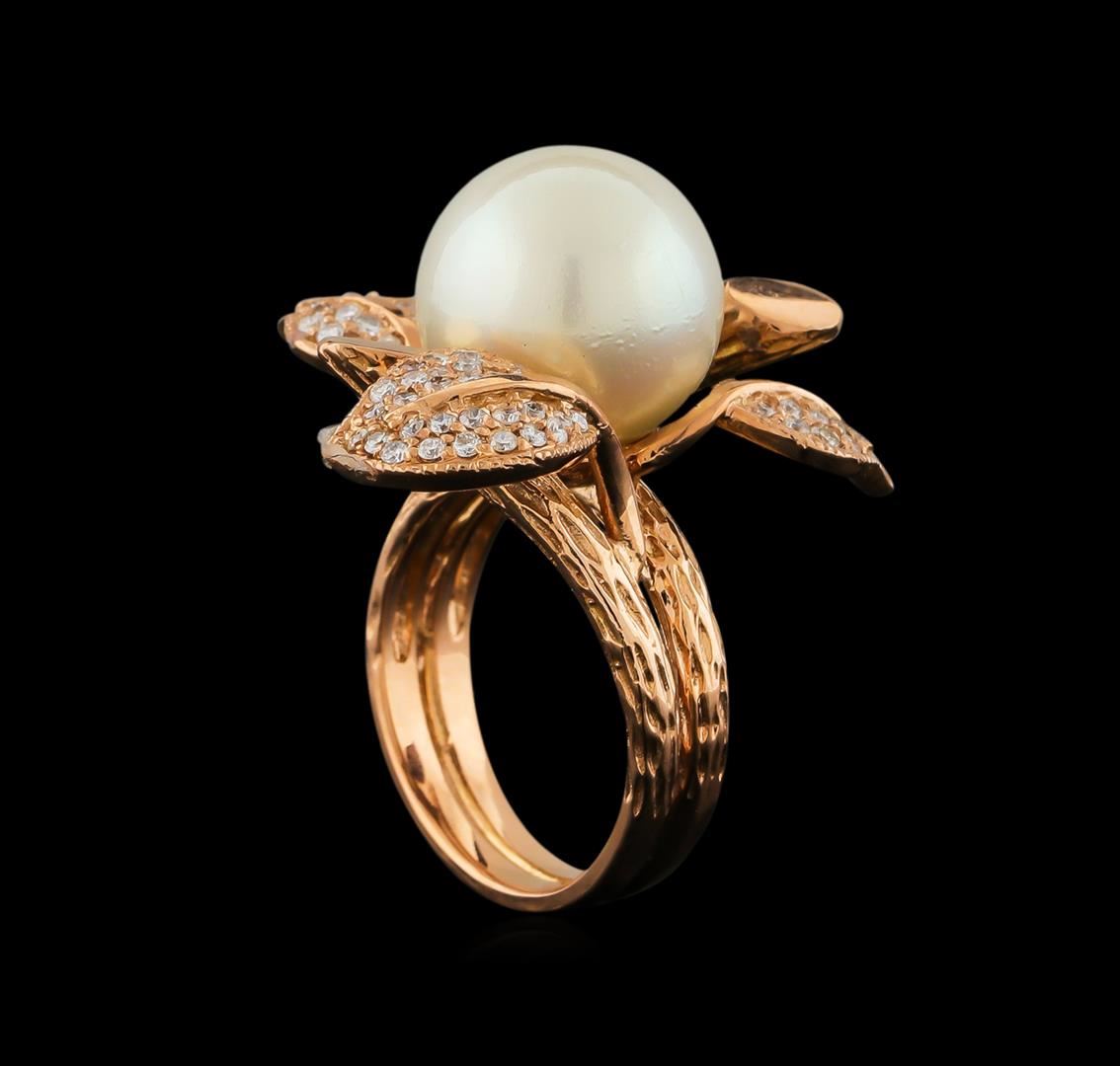 One electronically tested 14KT rose gold ladies combination cast & assembled ring with a bright polish finish. Identified with markings of "K14". Condition is new. Containing: One Chinese freshwater pearl, 13.0mm in size to 13.0mm in size. The pearl is white in color with a good luster, round, moderately blemished. Sixty-Two prong set round brilliant cut diamonds, measuring 1.50 - 1.30 x 0.84mm (depth est.) approximate total weight of 62 Stones = 0.62ct. Clarity: I-1 to I-2. Color: I - J, Cut is Good. Colored gemstones are presumed to have been subjected to commonly used enhancement processes. All diamonds and colored gemstones are graded in the mounting, unless otherwise stated. Total Weight of Diamonds 0.62ct. Total Weight of Ring 11.70 grams. GGL Appraised at $5,700.00.