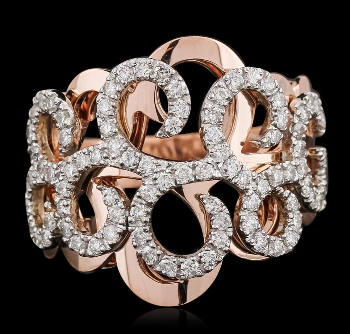 One electronically tested 14KT rose gold ladies combination cast & assembled ring with a bright polish finish. Identified with markings of "14K". Condition is new. Containing: Seventy-Eight prong set round brilliant cut diamonds, measuring 1.30 - 1.30 x 0.78mm (depth est.) approximate total weight of 78 Stones = 0.62ct. Clarity: I-1 to I-2. Color: I - J, Cut is Good. All diamonds are graded in the mounting, unless otherwise stated. Total Weight of Diamonds 0.62ct. Total Weight of Ring 9.80 grams. GGL Appraised at $5,155.00.