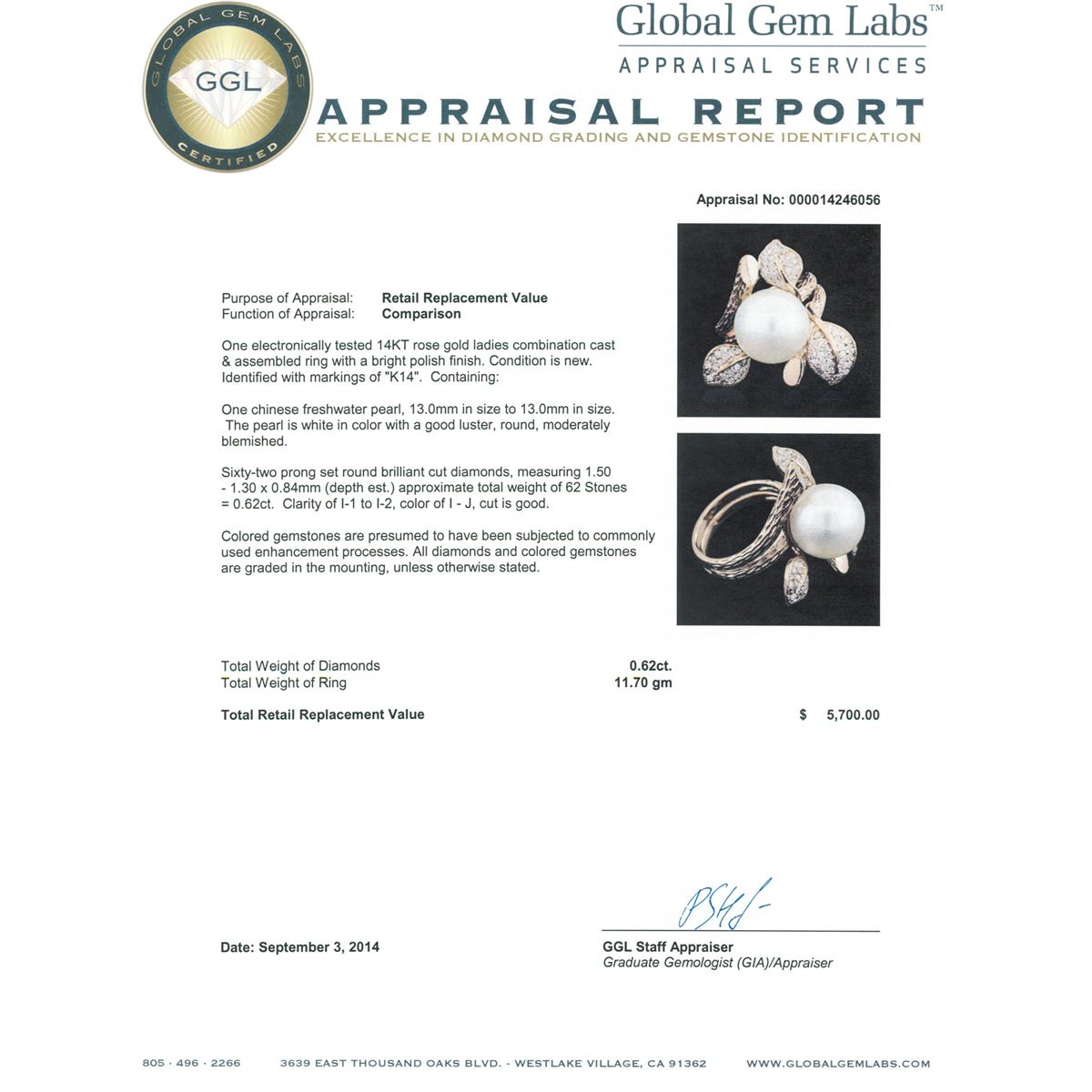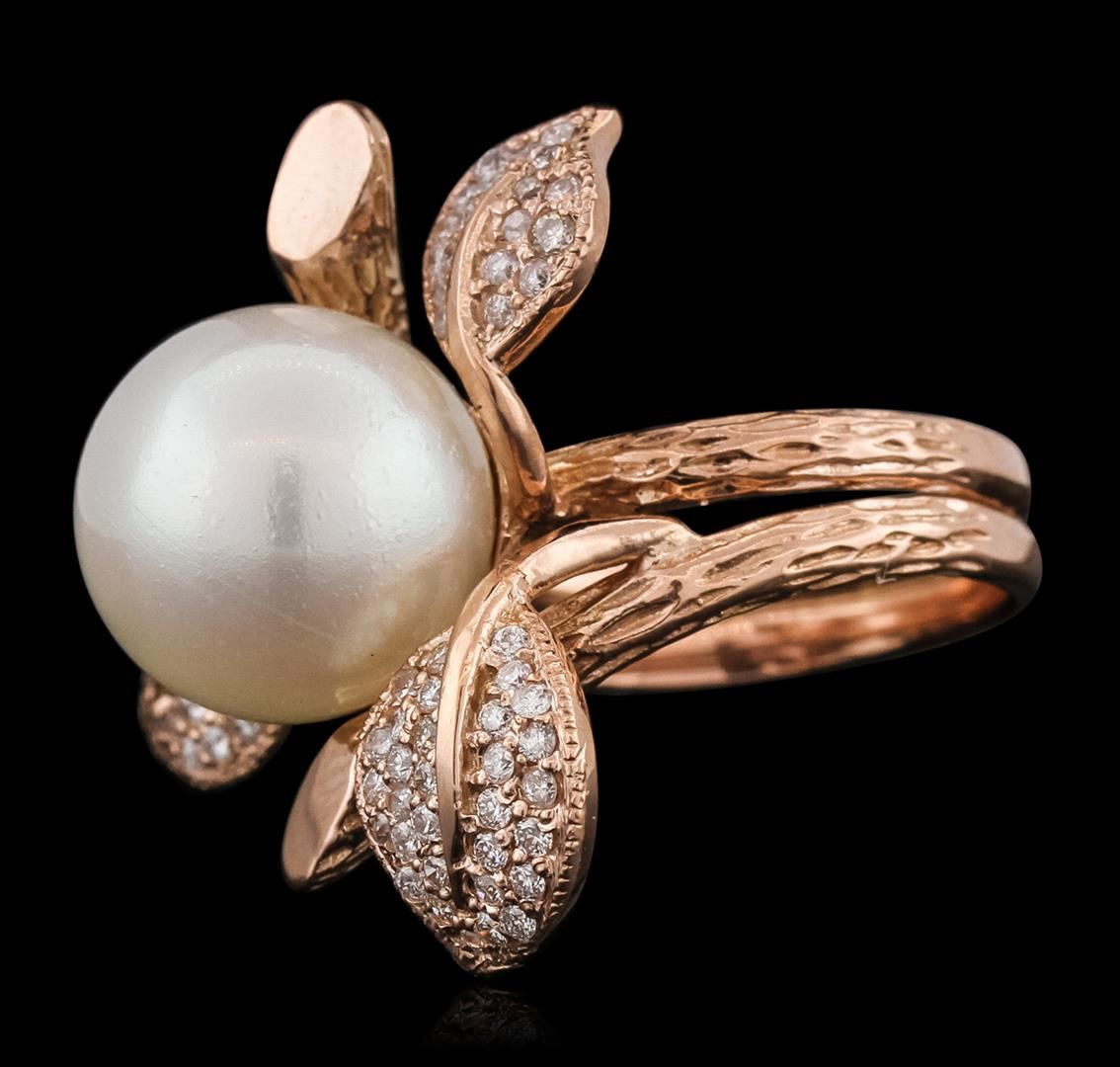 One electronically tested 14KT rose gold ladies combination cast & assembled ring with a bright polish finish. Identified with markings of "K14". Condition is new. Containing: One Chinese freshwater pearl, 13.0mm in size to 13.0mm in size. The pearl is white in color with a good luster, round, moderately blemished. Sixty-Two prong set round brilliant cut diamonds, measuring 1.50 - 1.30 x 0.84mm (depth est.) approximate total weight of 62 Stones = 0.62ct. Clarity: I-1 to I-2. Color: I - J, Cut is Good. Colored gemstones are presumed to have been subjected to commonly used enhancement processes. All diamonds and colored gemstones are graded in the mounting, unless otherwise stated. Total Weight of Diamonds 0.62ct. Total Weight of Ring 11.70 grams. GGL Appraised at $5,700.00.