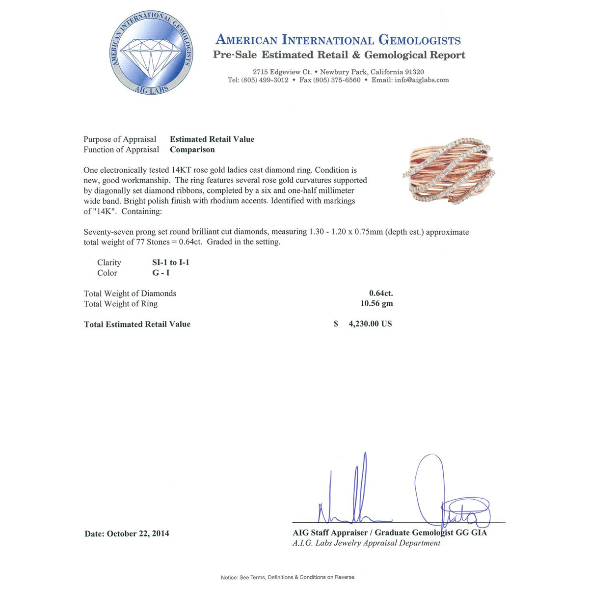 One electronically tested 14KT rose gold ladies cast diamond ring. The ring features several rose gold curvatures supported by diagonally set diamond ribbons, completed by a six and one-half millimeter wide band. Bright polish finish with rhodium accents. Identified with markings of 14K. Condition is new, good workmanship. Containing: Seventy-Seven prong set round brilliant cut diamonds, measuring 1.30 - 1.20 x 0.75mm (depth est.) approximate total weight of 77 Stones = 0.64ct. Graded in the setting. Clarity: SI-1 to I-1. Color: G - I. Total Weight of Diamonds 0.64ct. Total Weight of Ring 10.56 grams. AIG Appraised at $4,230.00.