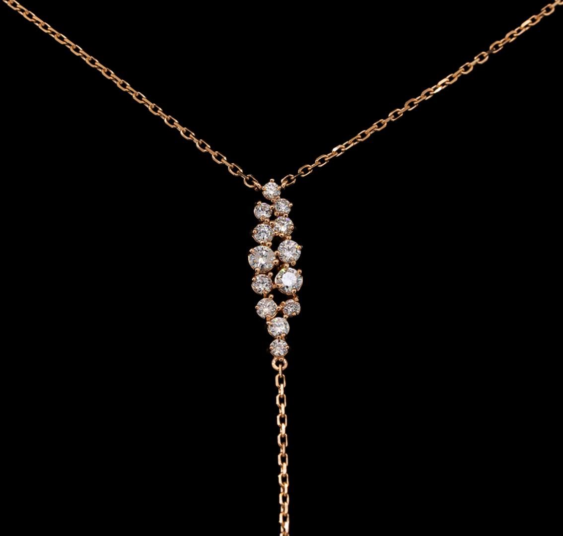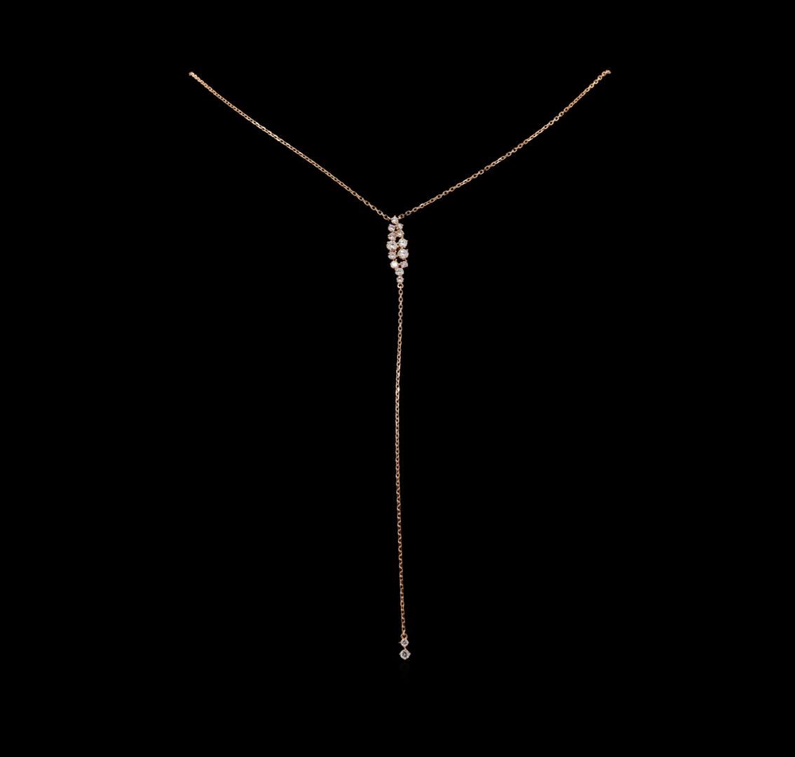 One electronically tested 14KT rose gold ladies cast diamond necklace with a lobster claw clasp with a bright polish finish. Identified with markings of "14K". Condition is new. Containing: Two prong set round brilliant cut diamonds, measuring 3.00 - 3.00 x 1.80mm (depth est.) approximate total weight of 2 Stones = 0.18ct. Clarity: I-1. Color: G - H, Cut is Good. Thirteen prong set round brilliant cut diamonds, measuring 2.50 - 1.50 x 1.20mm (depth est.) approximate total weight of 13 Stones = 0.51ct. Clarity: SI-1 to I-1. Color: H - I, Cut is Good. All diamonds are graded in the mounting, unless otherwise stated. Total Weight of Diamonds 0.69ct. Total Weight of Necklace 4.30 grams. GGL Appraised at $2,210.00.