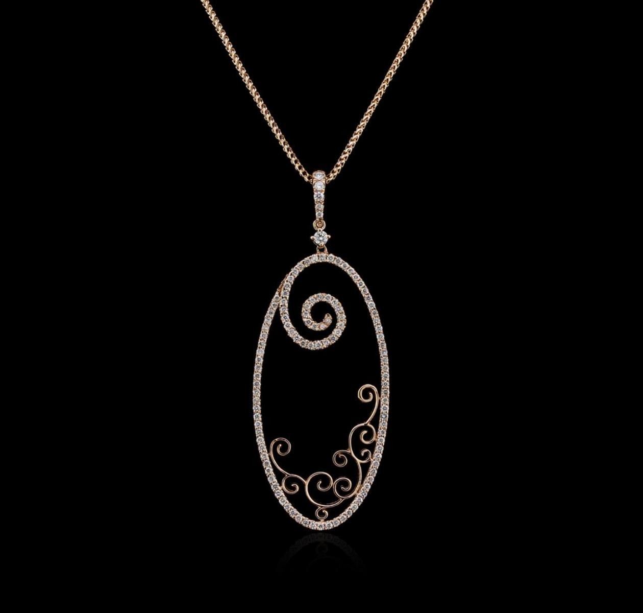 One electronically tested 14KT rose gold ladies cast diamond pendant & chain 16.0" long, with a lobster claw clasp with a bright polish finish. Identified with markings of "14K". Condition is new. Containing: One Hundred Ten prong set round brilliant cut diamonds, measuring 1.50 - 1.10 x 0.78mm (depth est.) approximate total weight of 110 Stones = 0.69ct. Clarity: I-1 to I-2. Color: I - J, Cut is Good. Diamonds are graded in the mounting, unless otherwise stated. Total Weight of Diamonds 0.69ct. Total Weight of Pendant & Chain 7.20 grams. GGL Appraised.