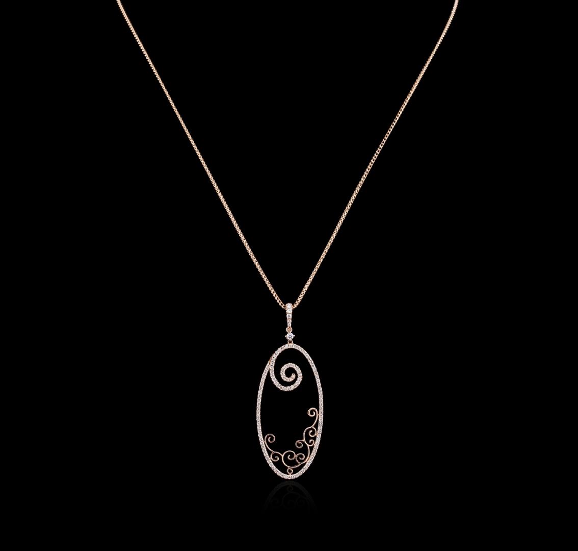 One electronically tested 14KT rose gold ladies cast diamond pendant & chain 16.0" long, with a lobster claw clasp with a bright polish finish. Identified with markings of "14K". Condition is new. Containing: One Hundred Ten prong set round brilliant cut diamonds, measuring 1.50 - 1.10 x 0.78mm (depth est.) approximate total weight of 110 Stones = 0.69ct. Clarity: I-1 to I-2. Color: I - J, Cut is Good. Diamonds are graded in the mounting, unless otherwise stated. Total Weight of Diamonds 0.69ct. Total Weight of Pendant & Chain 7.20 grams. GGL Appraised at $2,020.00.