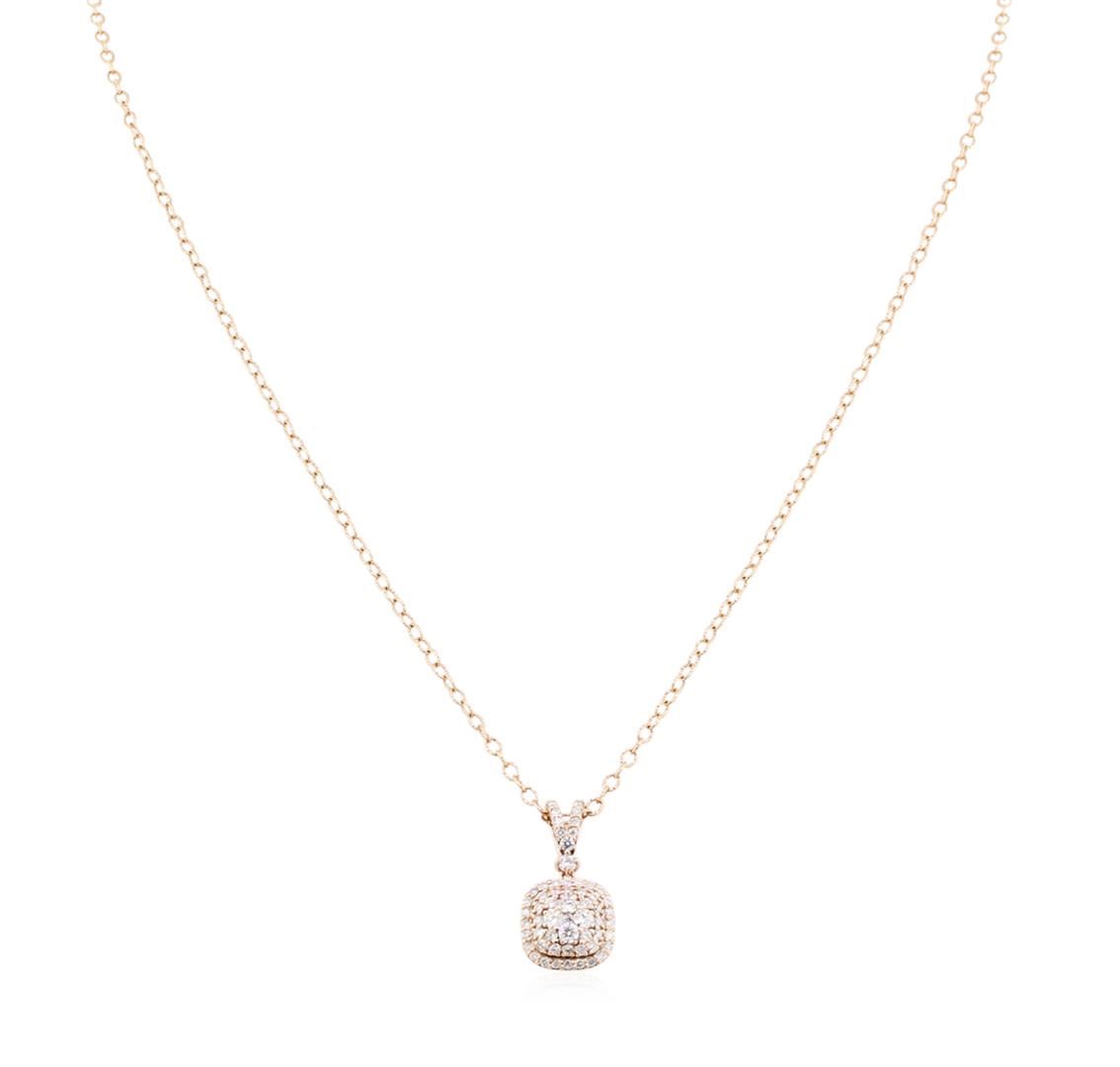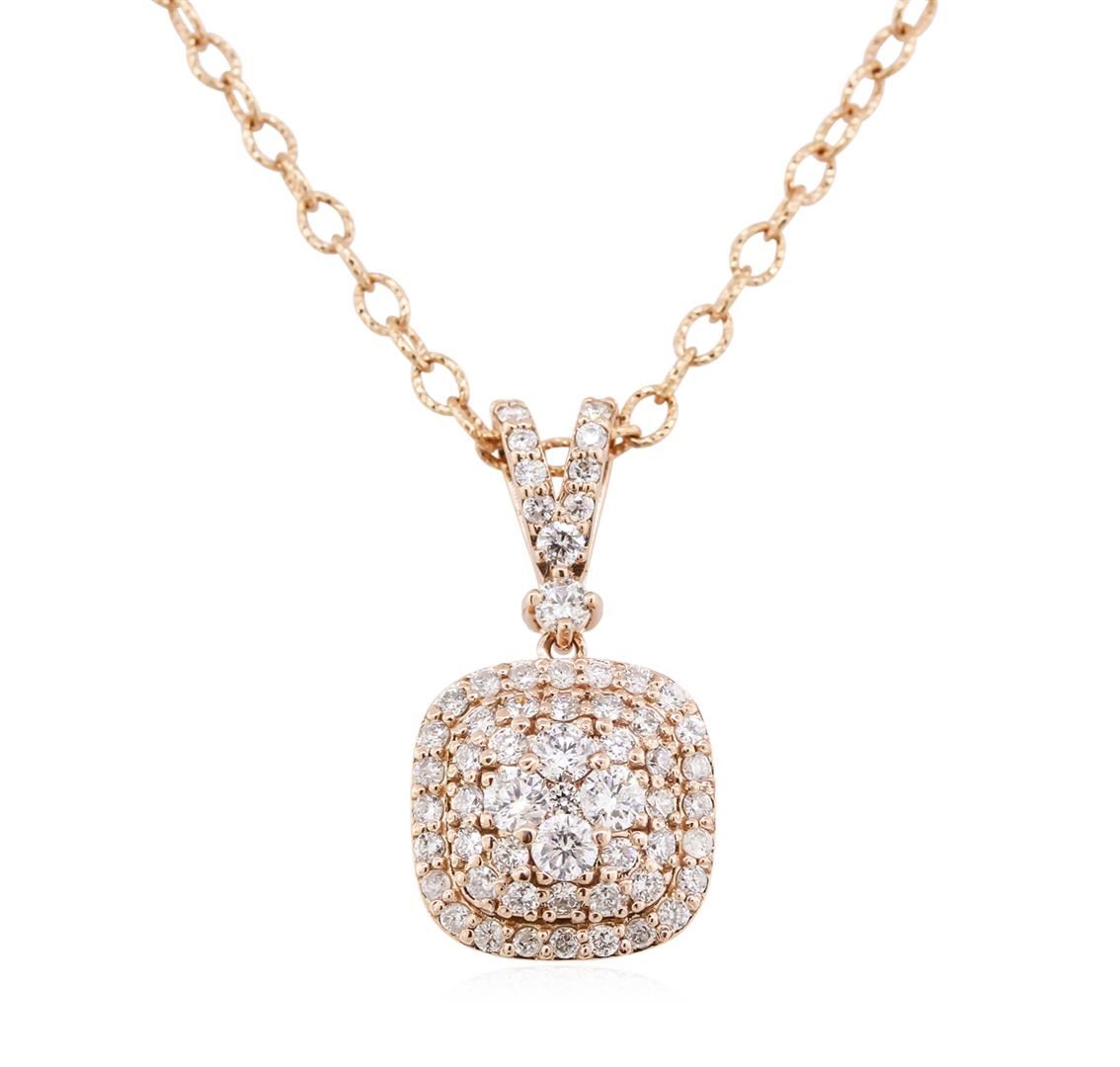 One pendant with chain featuring: 14KT rose gold weighing 2.15 grams containing 61 diamonds with a total weight of 0.74ct.