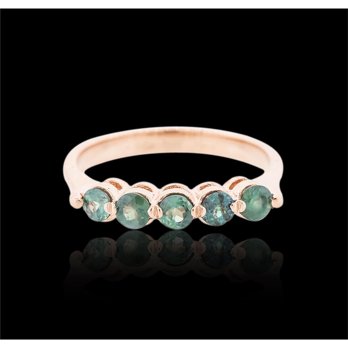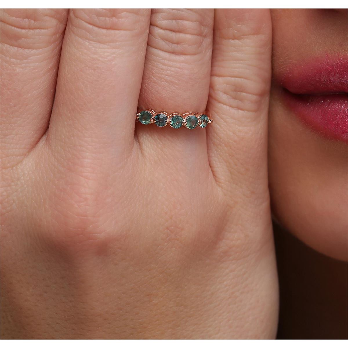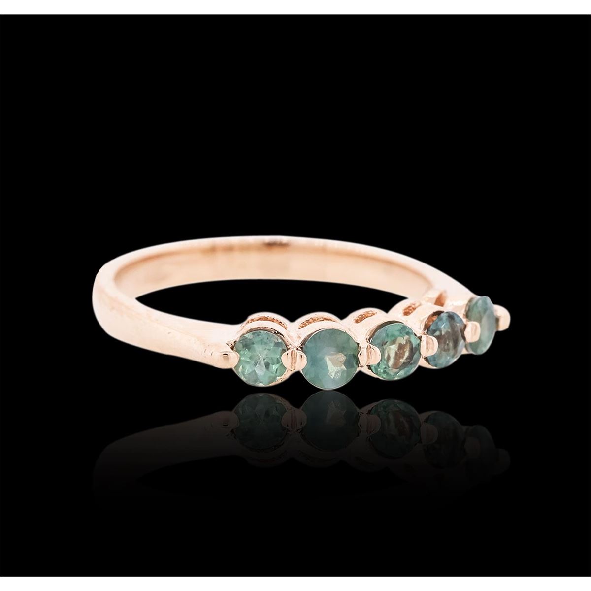 One electronically tested 14KT rose gold ladies cast green chrysoberyl and diamond ring with a bright polish finish. The ring features a green chrysoberyl curvature, completed by a two and one-half millimeter wide band. Identified with markings of "K14". Condition is new, good workmanship. Containing: Five prong set round brilliant cut natural green chrysoberyls, measuring 3.10 - 3.00 x 1.80 mm, approximate total weight of 0.75ct., clarity is slightly included, medium dark, moderately strong, very slightly bluish green color, (GIA vslbG 6/4), cut is good. Transmitting light with a minimum of distortion, transparent. Naturally occurring internal & external characteristics are present. Color grade is an average for the group. Graded in the setting. Total Weight of Colored Stones 0.75ct. Total Weight of Ring 2.34 grams. AIG Appraised at $655.00.