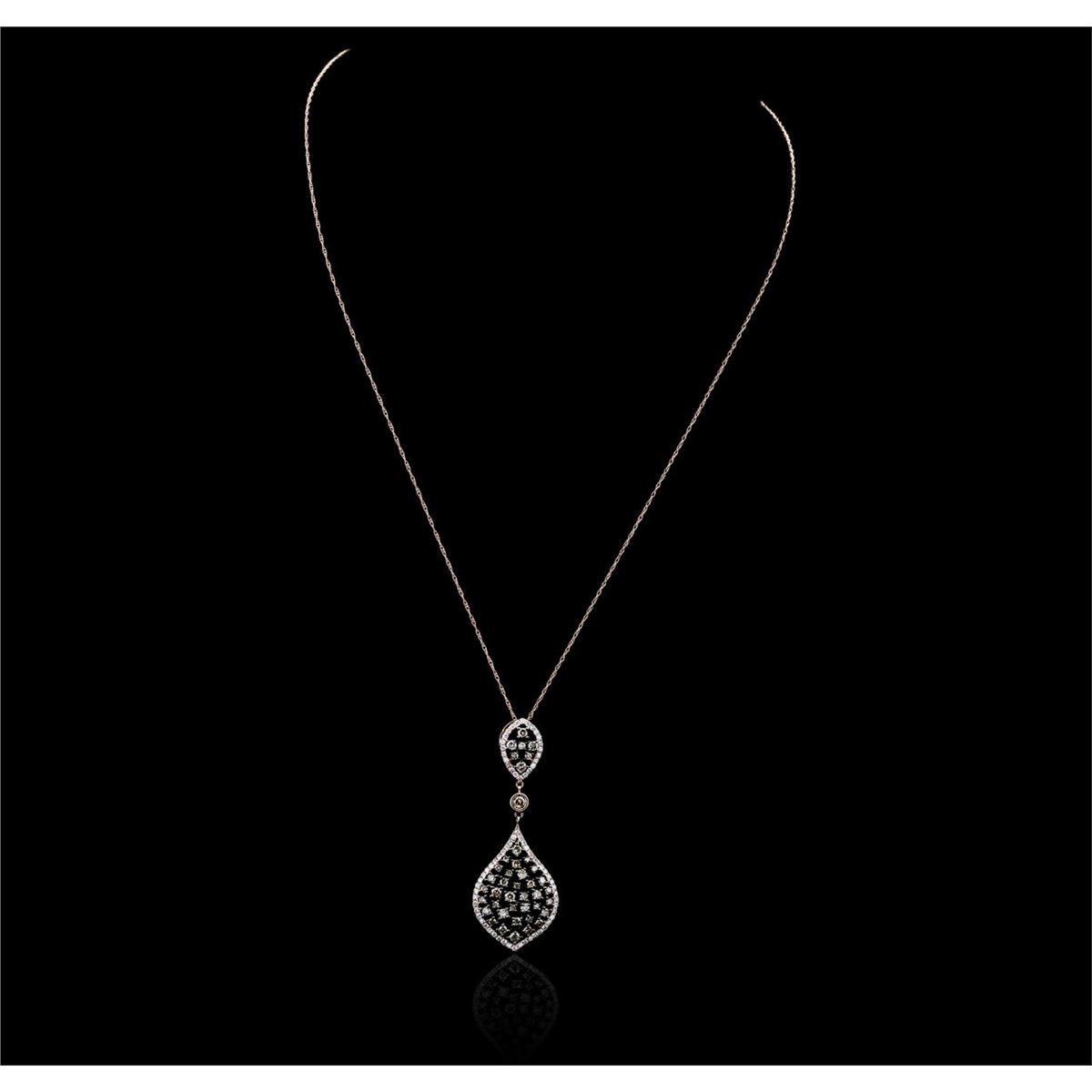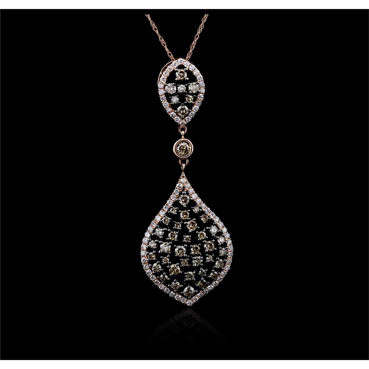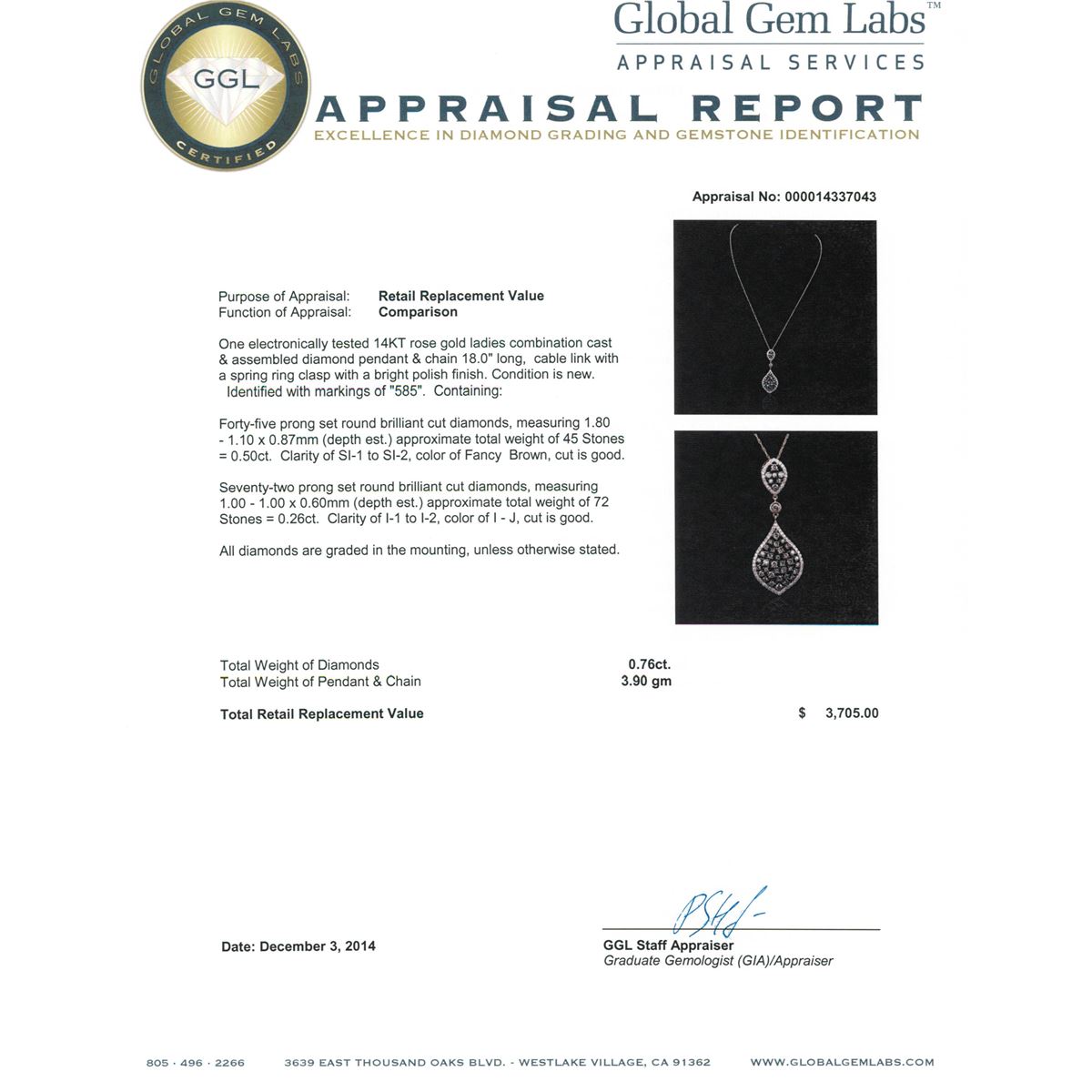 One electronically tested 14KT rose gold ladies combination cast & assembled diamond pendant & chain 18.0" long, cable link with a spring ring clasp with a bright polish finish. Identified with markings of "585". Condition is new. Containing: Forty-Five prong set round brilliant cut diamonds, measuring 1.80 - 1.10 x 0.87mm (depth est.) approximate total weight of 45 Stones = 0.50ct. Clarity: SI-1 to SI-2, Cut is Good. Seventy-Two prong set round brilliant cut diamonds, measuring 1.00 - 1.00 x 0.60mm (depth est.) approximate total weight of 72 Stones = 0.26ct. Clarity: I-1 to I-2. Color: I - J, Cut is Good. All diamonds are graded in the mounting, unless otherwise stated. Total Weight of Diamonds 0.76ct. Total Weight of Pendant & Chain 3.90 grams. GGL Appraised at $3,705.00.