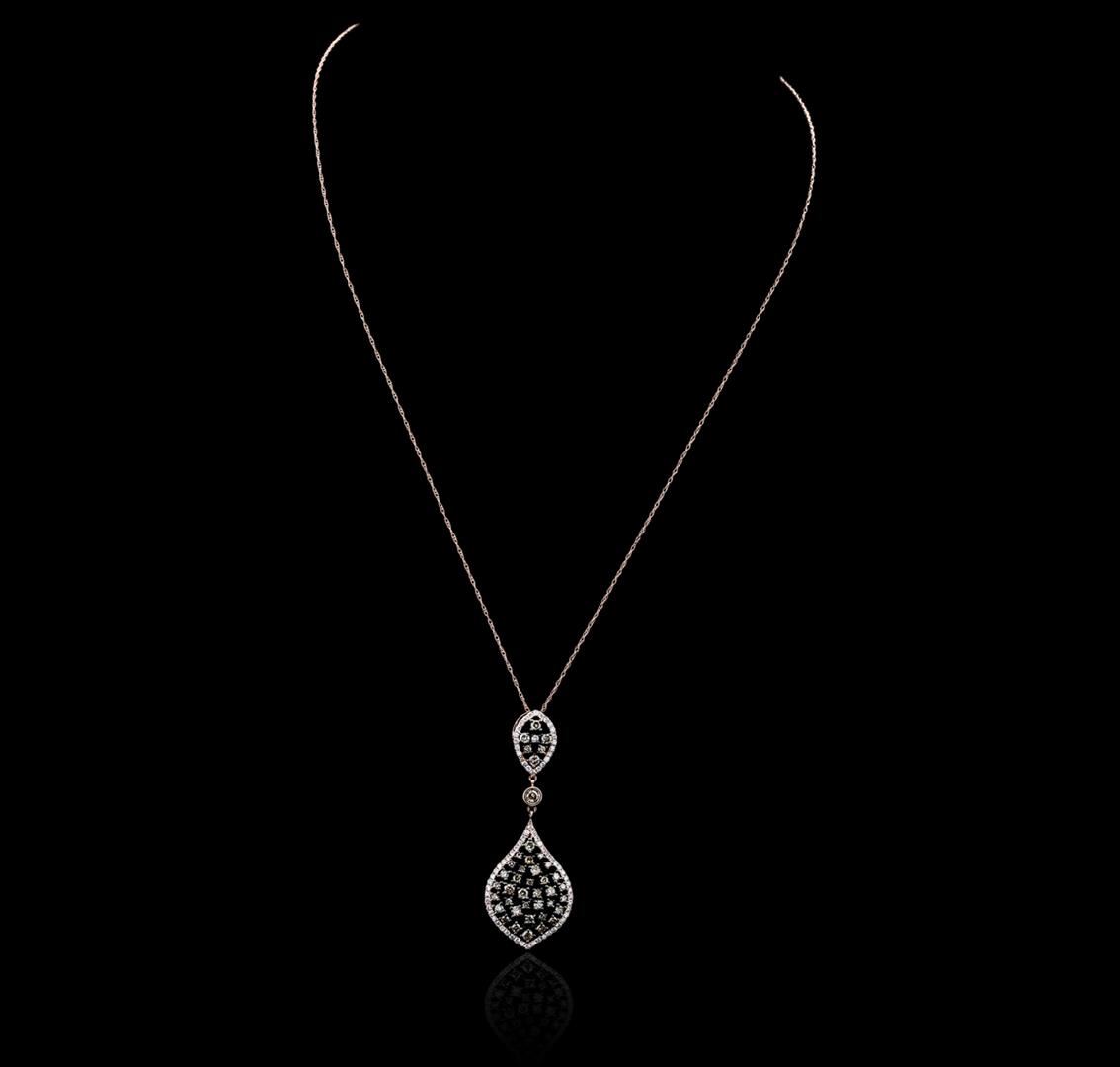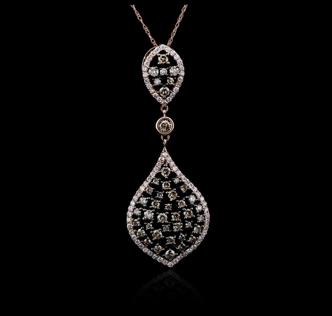 One electronically tested 14KT rose gold ladies combination cast & assembled diamond pendant & chain 18.0" long, cable link with a spring ring clasp with a bright polish finish. Identified with markings of "585". Condition is new. Containing: Forty-Five prong set round brilliant cut diamonds, measuring 1.80 - 1.10 x 0.87mm (depth est.) approximate total weight of 45 Stones = 0.50ct. Clarity: SI-1 to SI-2, Cut is Good. Seventy-Two prong set round brilliant cut diamonds, measuring 1.00 - 1.00 x 0.60mm (depth est.) approximate total weight of 72 Stones = 0.26ct. Clarity: I-1 to I-2. Color: I - J, Cut is Good. All diamonds are graded in the mounting, unless otherwise stated. Total Weight of Diamonds 0.76ct. Total Weight of Pendant & Chain 3.90 grams. GGL Appraised at $3,705.00.