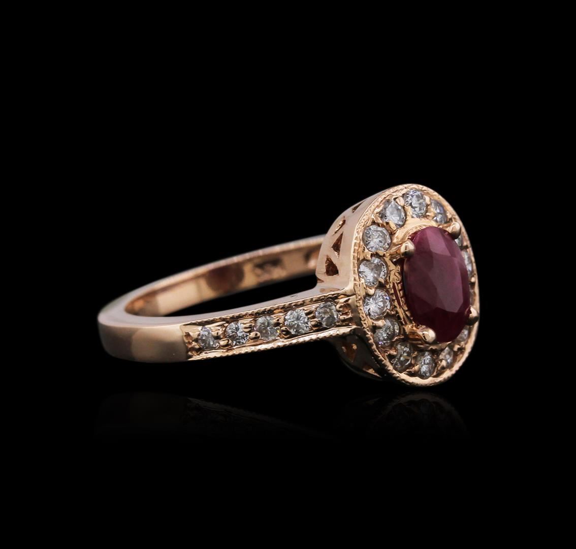 One ring featuring: 14KT rose gold weighing 5.00 grams containing one ruby center stone with a total weight of 0.78ct and 24 diamonds with a total weight of 0.43ct.