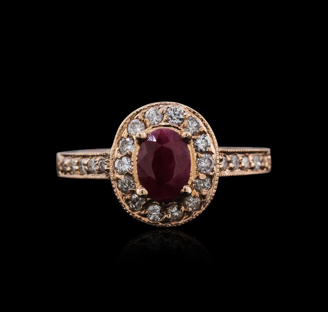 One ring featuring: 14KT rose gold weighing 5.00 grams containing one ruby center stone with a total weight of 0.78ct and 24 diamonds with a total weight of 0.43ct.