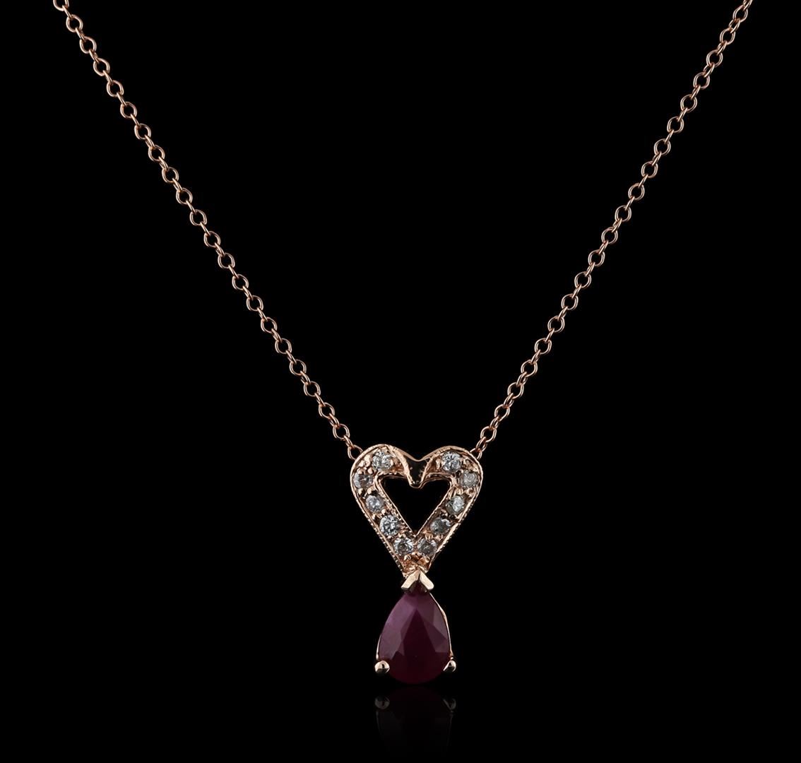 One pendant with chain featuring: 14KT rose gold weighing 2.65 grams containing one ruby with a total weight of 0.84ct and ten diamonds with a total weight of 0.12ct.