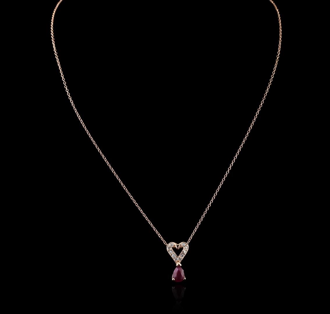 One pendant with chain featuring: 14KT rose gold weighing 2.65 grams containing one ruby with a total weight of 0.84ct and ten diamonds with a total weight of 0.12ct.