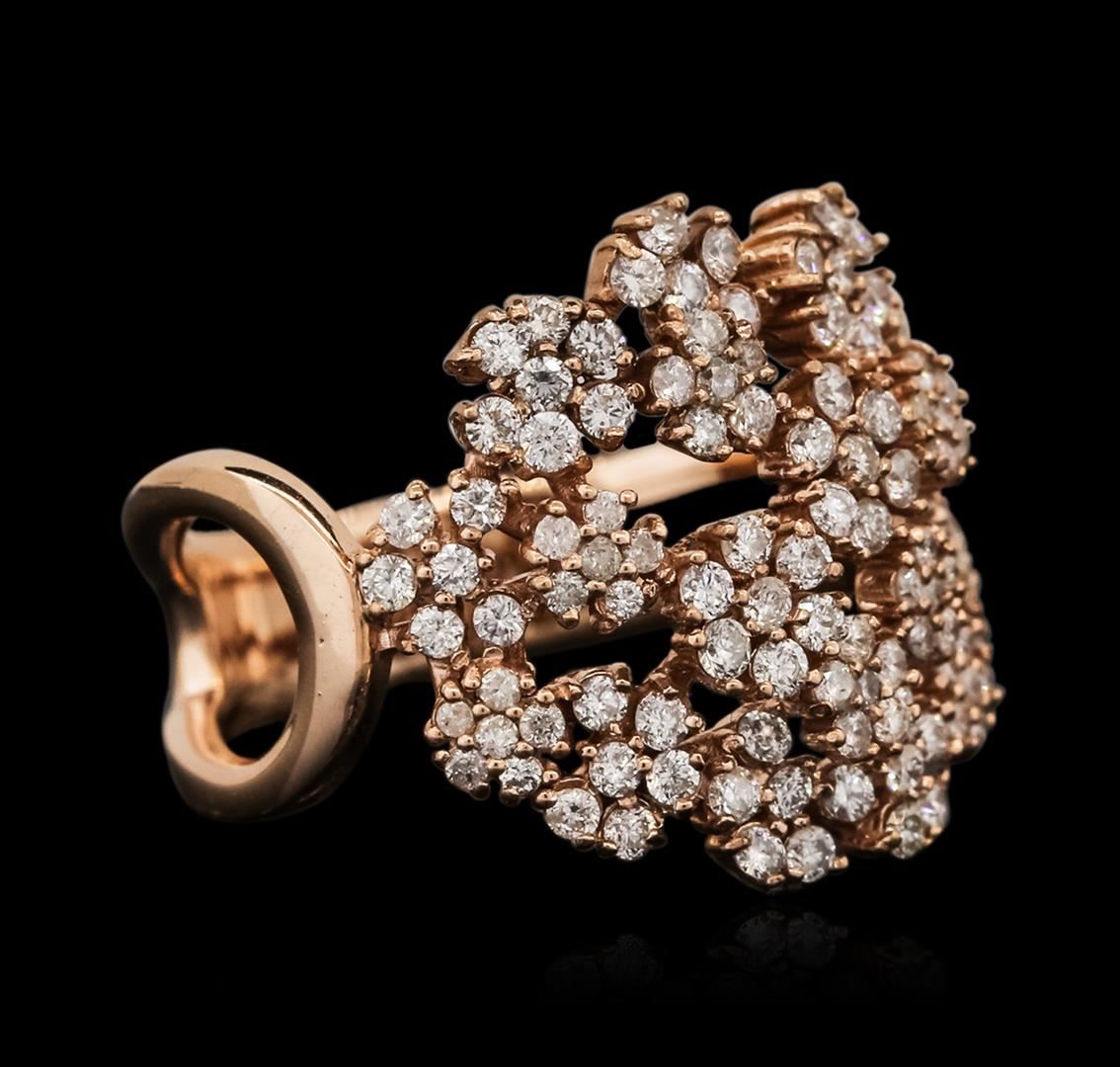 One electronically tested 14KT rose gold ladies combination cast & assembled diamond ring with a bright polish finish. Identified with markings of "585". Condition is new. Containing: One Hundred Eight prong set round brilliant cut diamonds, measuring 1.30 - 1.30 x 0.78mm (depth est.) approximate total weight of 108 Stones = 0.86ct. Clarity: SI-2 to I-1. Color: I - J, Cut is Good. All diamonds are graded in the mounting, unless otherwise stated. Total Weight of Diamonds 0.86ct. Total Weight of Ring 5.30 grams. GGL Appraised at $3,635.00.