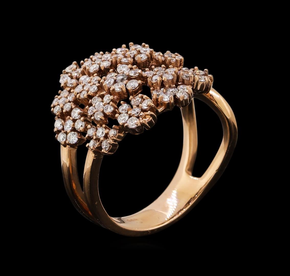 One electronically tested 14KT rose gold ladies combination cast & assembled diamond ring with a bright polish finish. Identified with markings of "585". Condition is new. Containing: One Hundred Eight prong set round brilliant cut diamonds, measuring 1.30 - 1.30 x 0.78mm (depth est.) approximate total weight of 108 Stones = 0.86ct. Clarity: SI-2 to I-1. Color: I - J, Cut is Good. All diamonds are graded in the mounting, unless otherwise stated. Total Weight of Diamonds 0.86ct. Total Weight of Ring 5.30 grams. GGL Appraised at $3,635.00.
