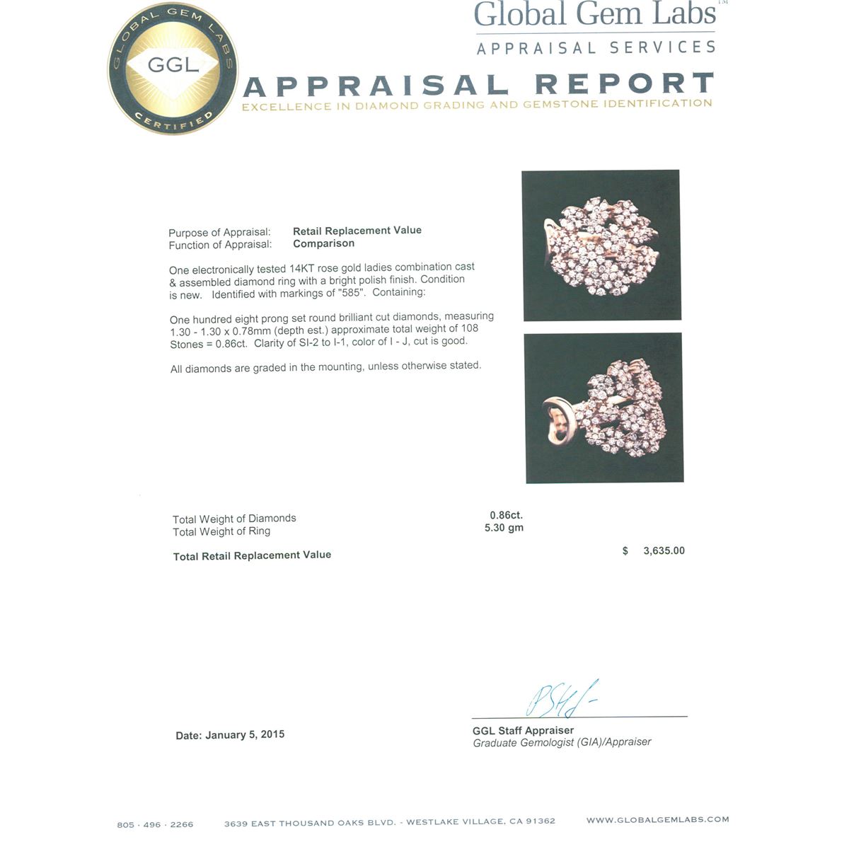 One electronically tested 14KT rose gold ladies combination cast & assembled diamond ring with a bright polish finish. Identified with markings of "585". Condition is new. Containing: One Hundred Eight prong set round brilliant cut diamonds, measuring 1.30 - 1.30 x 0.78mm (depth est.) approximate total weight of 108 Stones = 0.86ct. Clarity: SI-2 to I-1. Color: I - J, Cut is Good. All diamonds are graded in the mounting, unless otherwise stated. Total Weight of Diamonds 0.86ct. Total Weight of Ring 5.30 grams. GGL Appraised at $3,635.00.