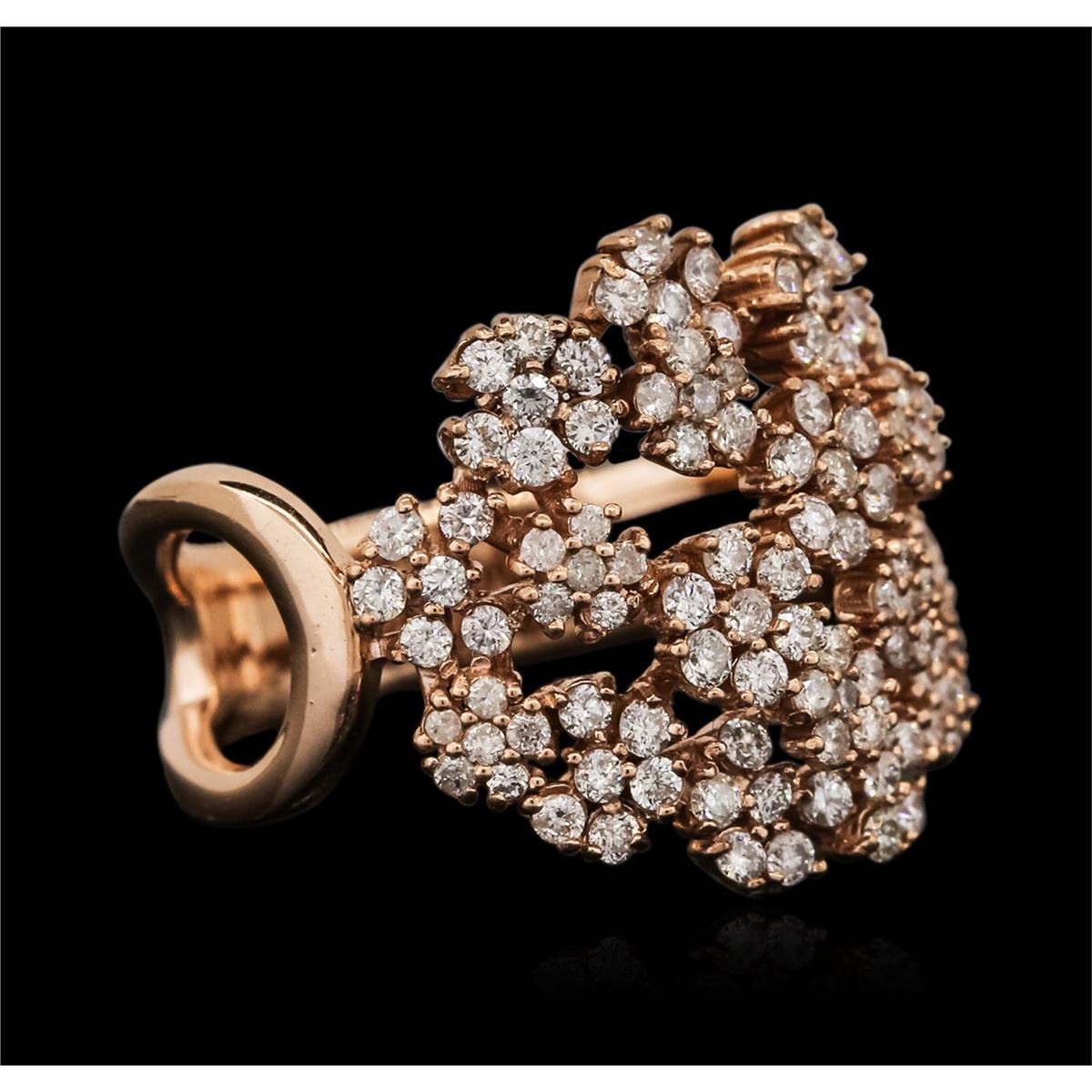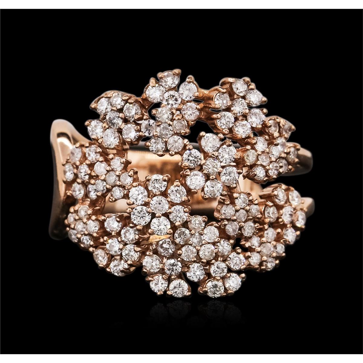 One electronically tested 14KT rose gold ladies combination cast & assembled diamond ring with a bright polish finish. Identified with markings of "585". Condition is new. Containing: One Hundred Eight prong set round brilliant cut diamonds, measuring 1.30 - 1.30 x 0.78mm (depth est.) approximate total weight of 108 Stones = 0.86ct. Clarity: SI-2 to I-1. Color: I - J, Cut is Good. All diamonds are graded in the mounting, unless otherwise stated. Total Weight of Diamonds 0.86ct. Total Weight of Ring 5.30 grams. GGL Appraised at $3,635.00.