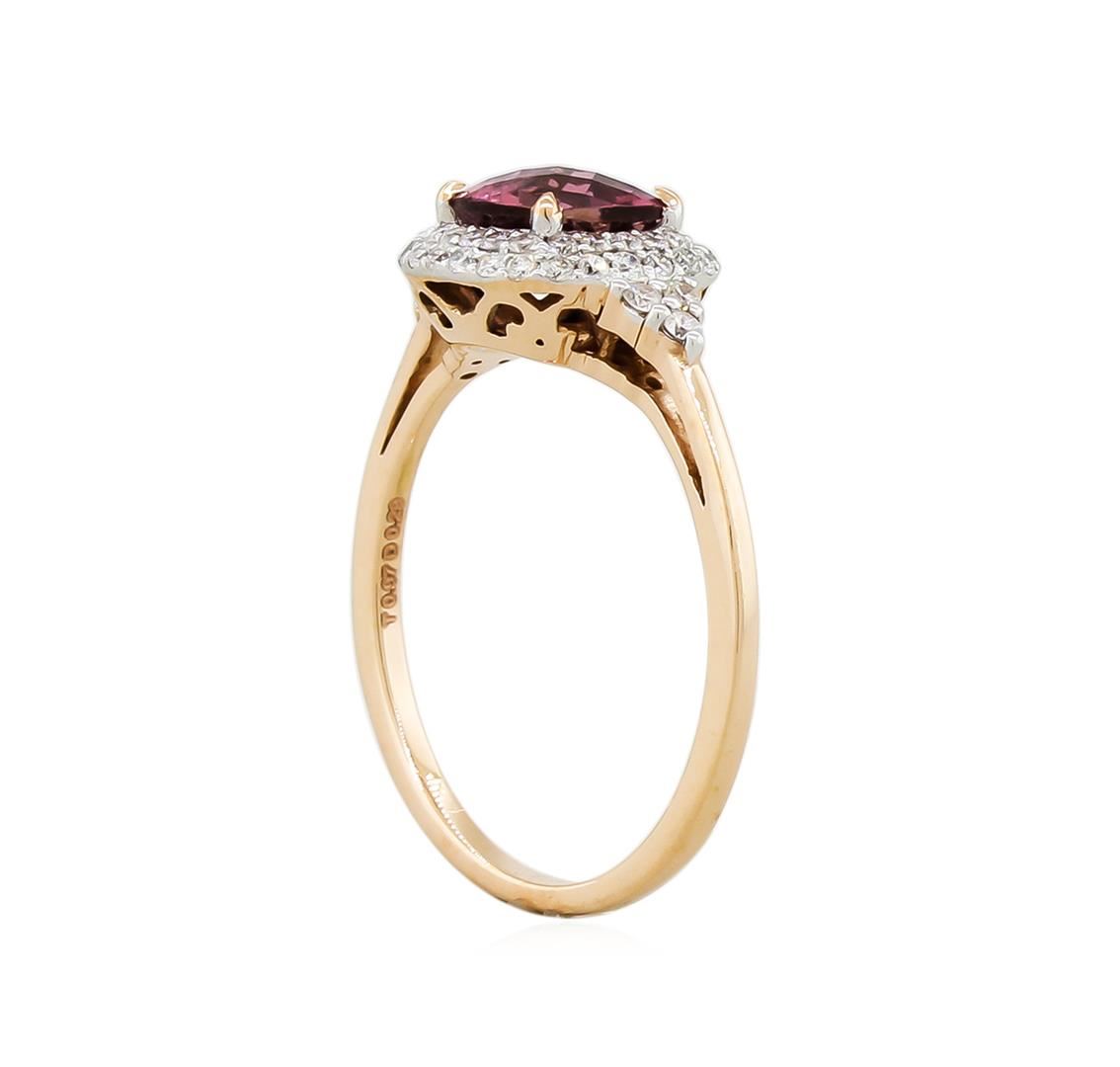 One tourmaline and diamond ring featuring 2.20 grams 14KT Rose Gold and a 0.90 carat tourmaline center-stone surrounded by 0.29 carats of round diamonds.