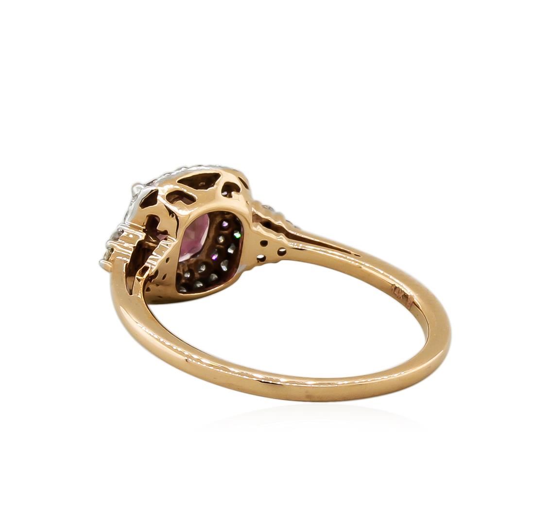 One tourmaline and diamond ring featuring 2.20 grams 14KT Rose Gold and a 0.90 carat tourmaline center-stone surrounded by 0.29 carats of round diamonds.