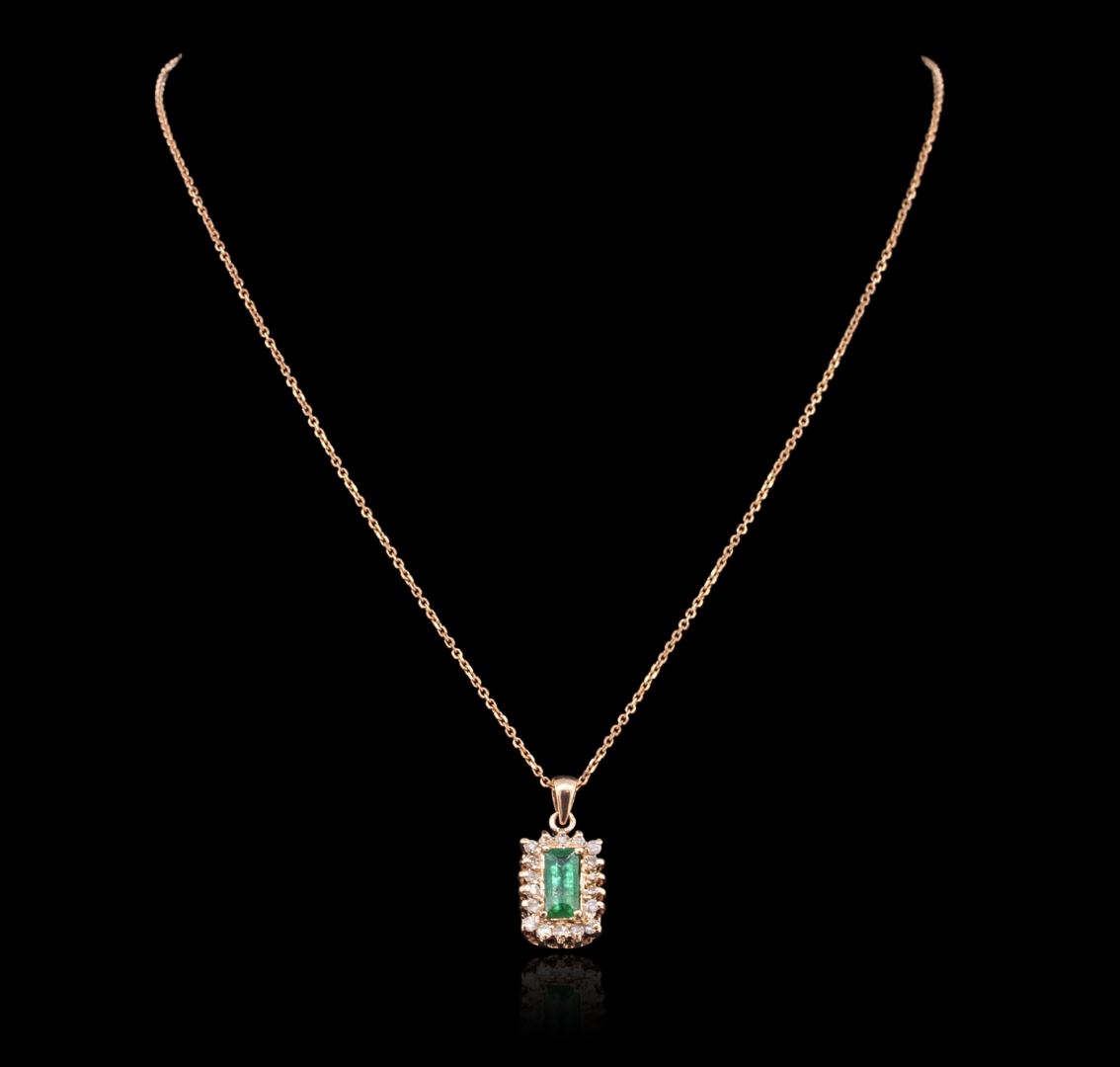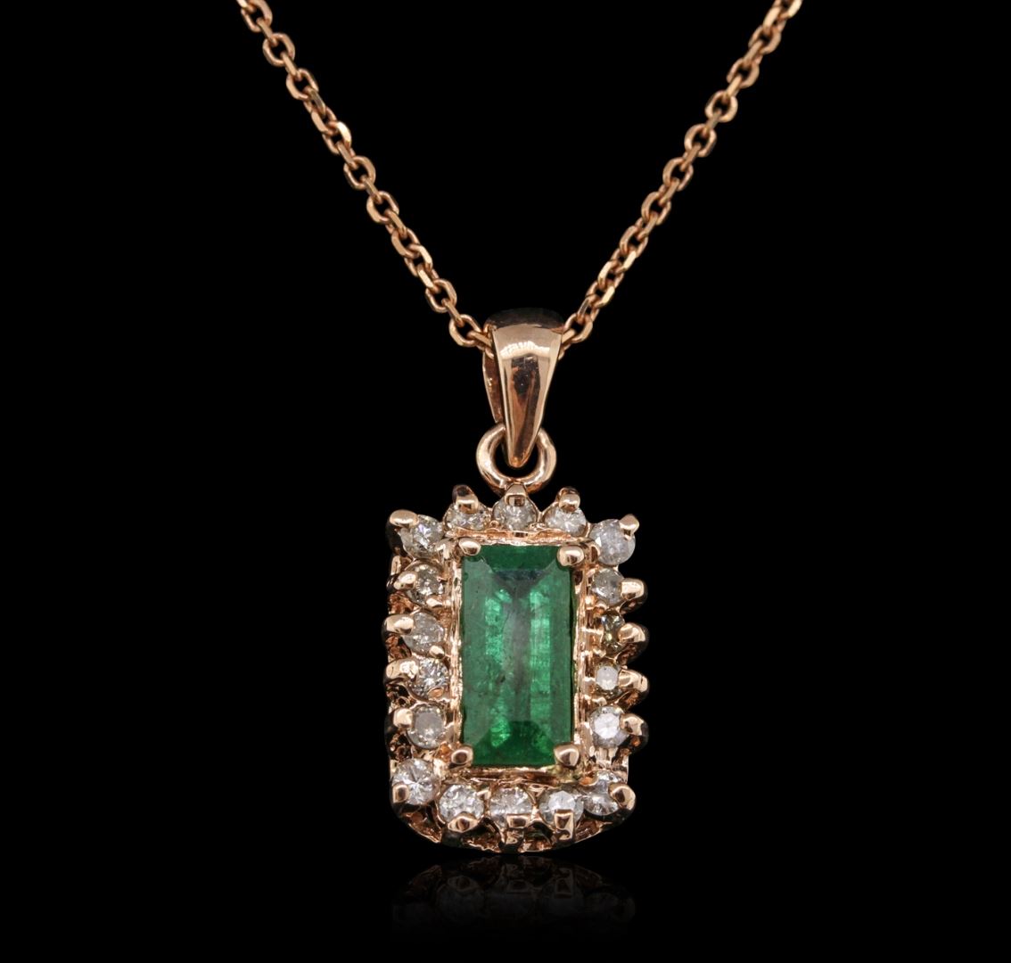 One pendant with chain featuring: 14KT rose gold with a total weight of 2.90 grams, emerald with a total weight of 0.91ct, and diamonds with a total weight of 0.40ctw.