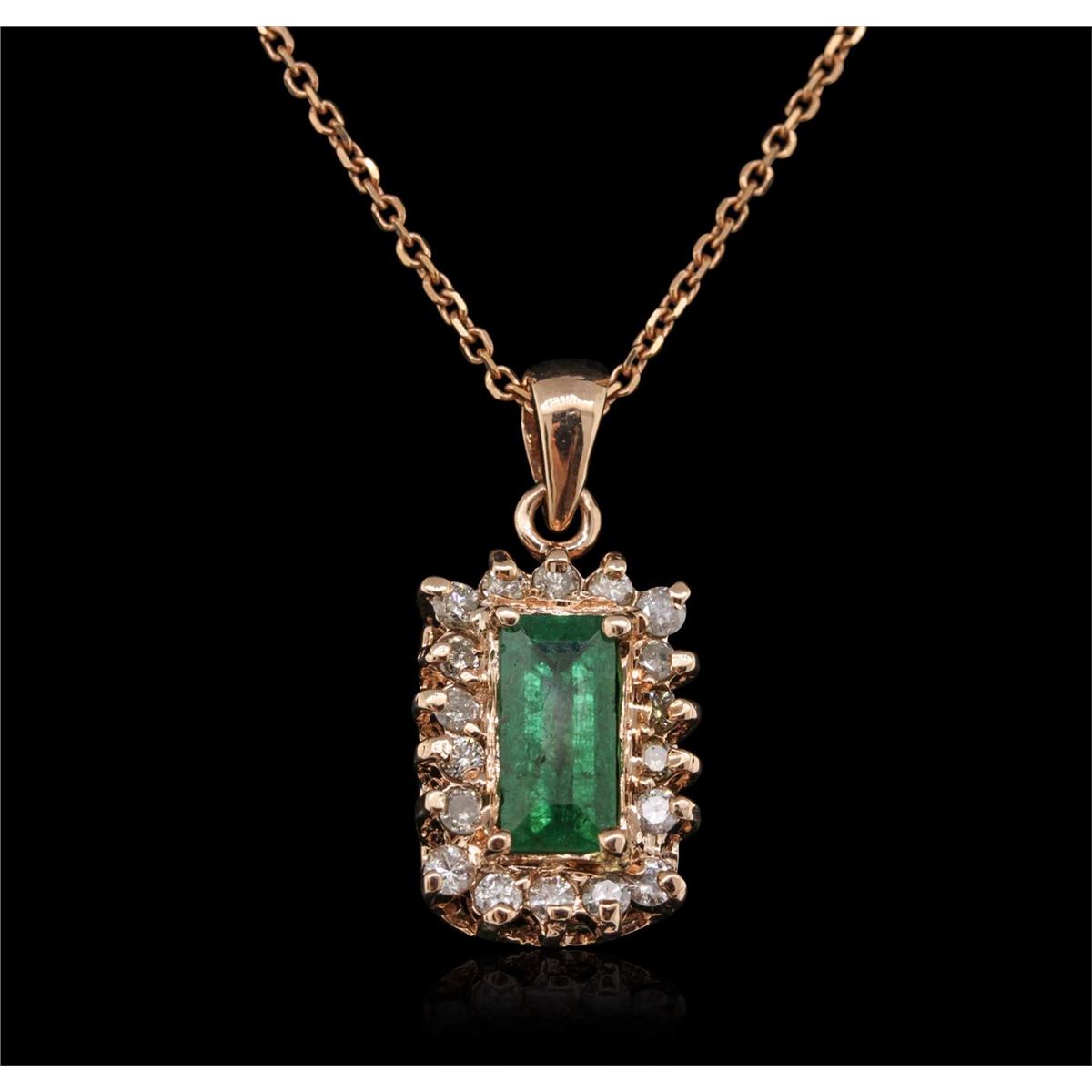One pendant with chain featuring: 14KT rose gold with a total weight of 2.90 grams, emerald with a total weight of 0.91ct, and diamonds with a total weight of 0.40ctw.