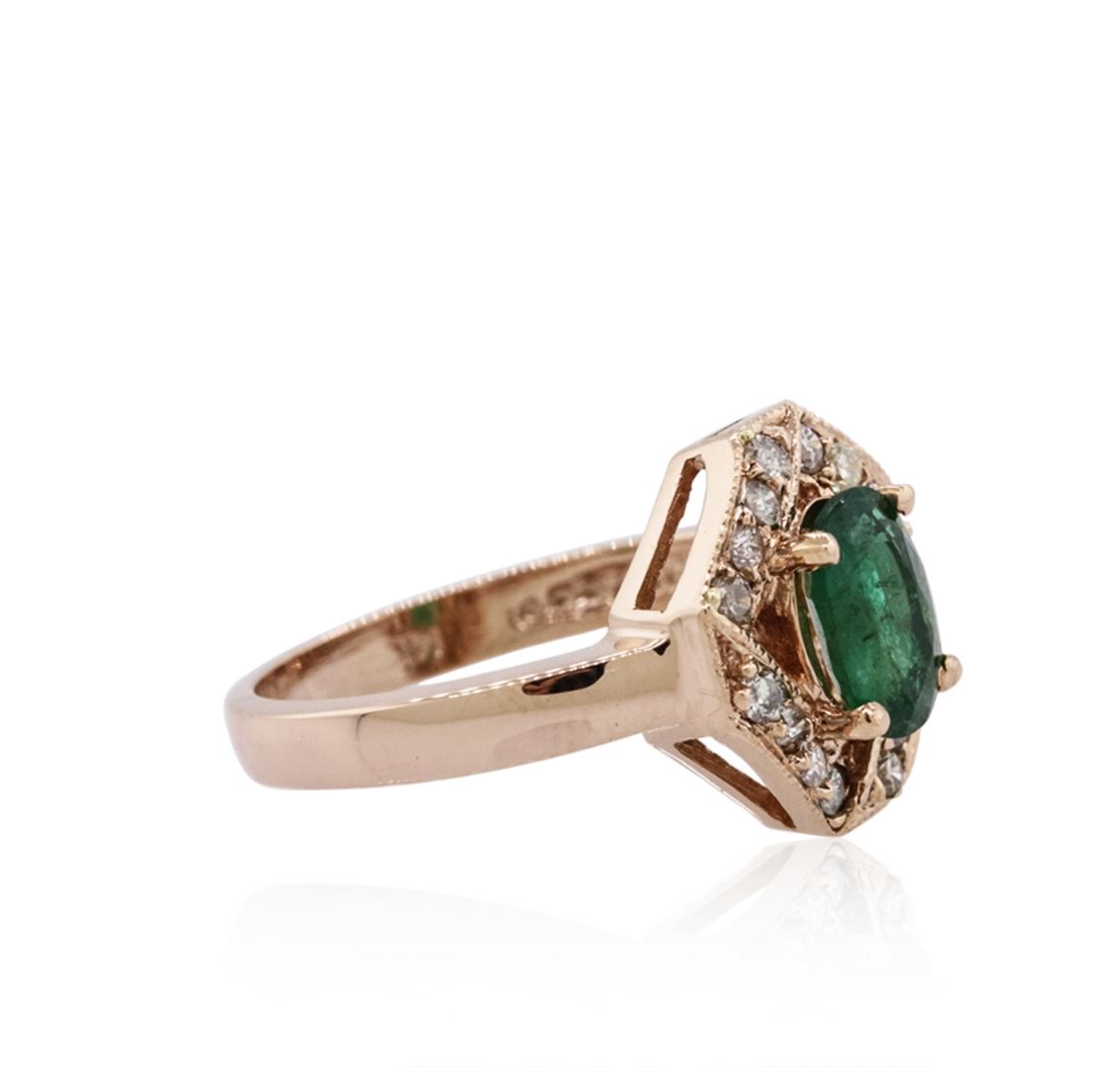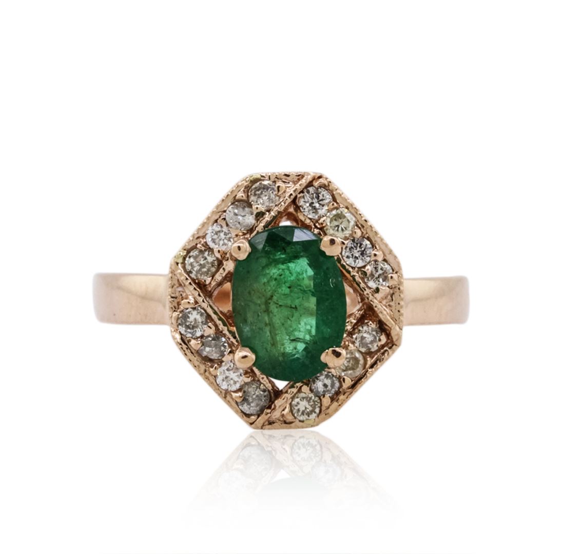 One ring featuring: 14KT rose gold weighing 5.00 grams containing one prong set oval cut emerald with a total weight of 0.94ct and pave set round cut diamonds with a total weight of 0.25cts.