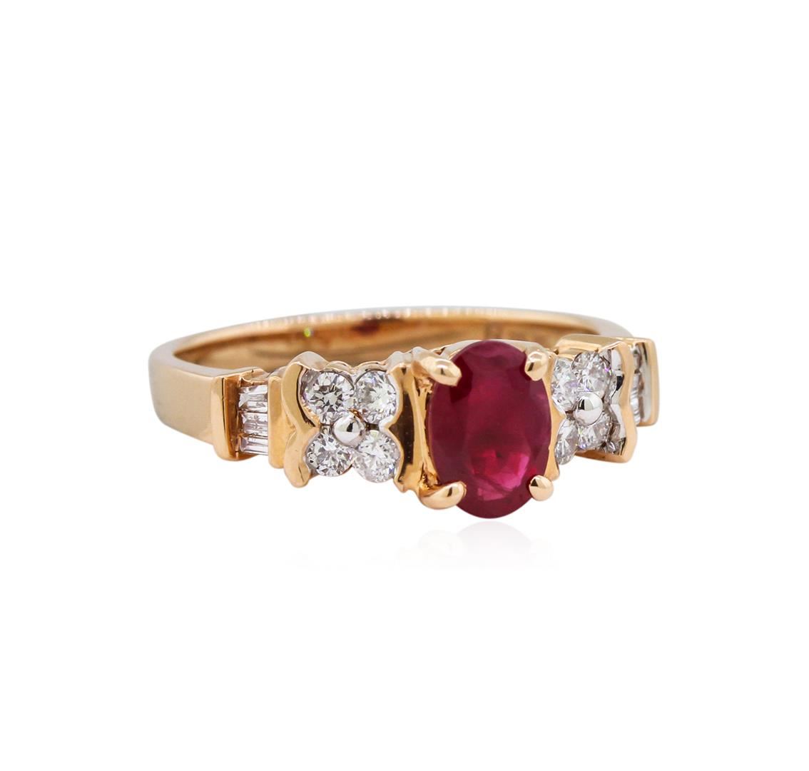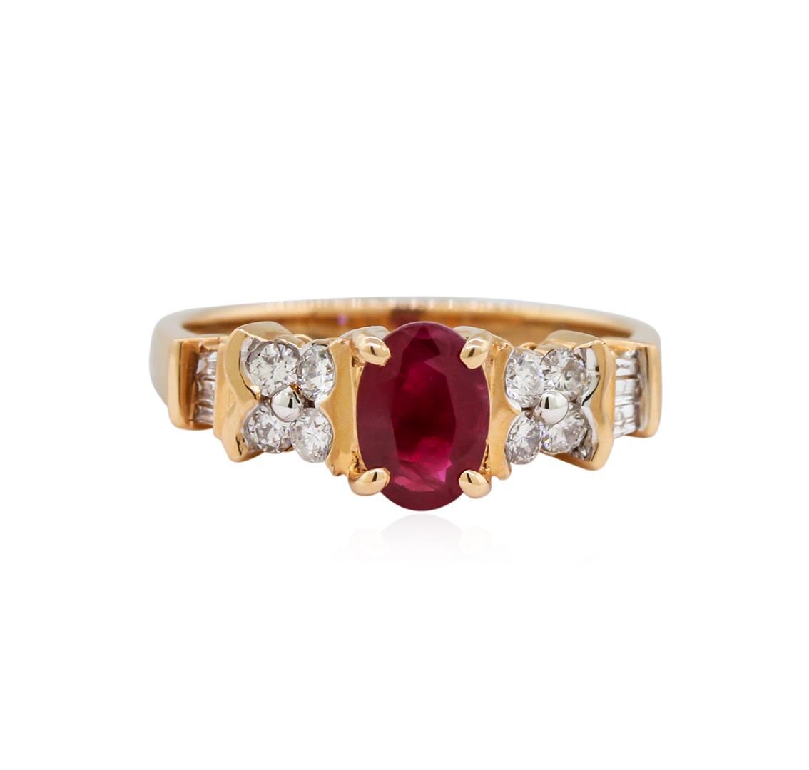 One ring featuring: 14KT Rose Gold with a total weight of 3.10 grams, (1) ruby with a total weight of 0.95ct, and baguette and round diamonds with a total weight of 0.35ct.