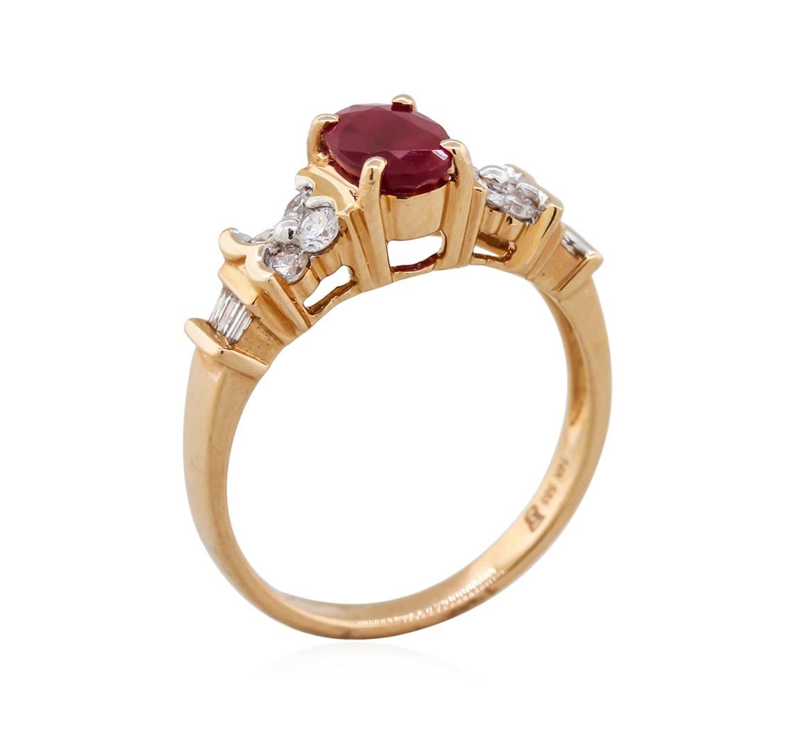 One ring featuring: 14KT Rose Gold with a total weight of 3.10 grams, (1) ruby with a total weight of 0.95ct, and baguette and round diamonds with a total weight of 0.35ct.