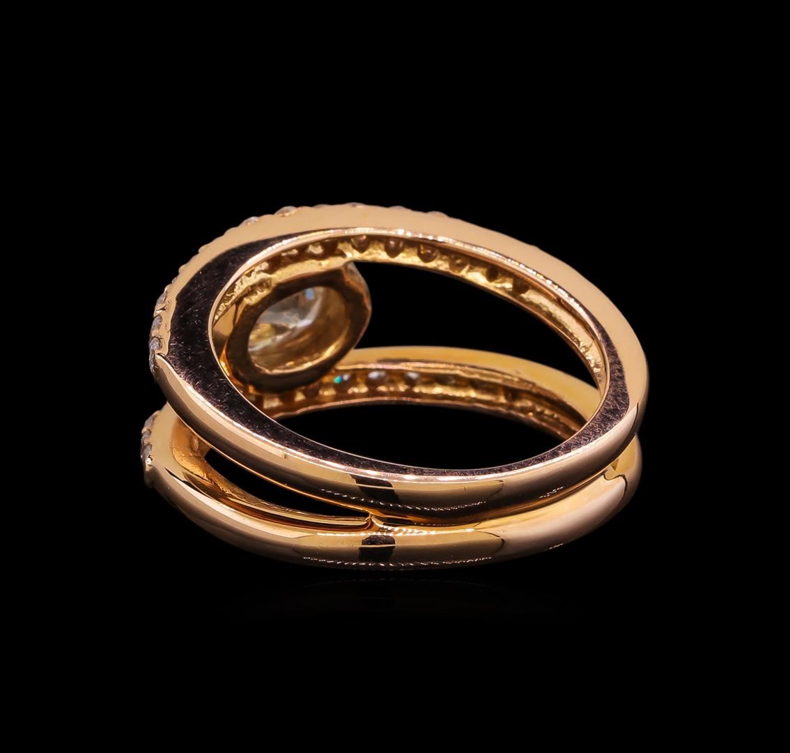 One electronically tested 14KT rose gold ladies cast diamond engagement ring with a bright polish finish. Identified with markings of "14K". Condition is new. Containing: One bezel set oval shaped cut diamond, measuring 6.50 x 5.00 x 3.50mm (depth est.) approximate weight of 0.72ct. Clarity: I-2. Color: J, Cut is Good. Thirty prong set round brilliant cut diamonds, measuring 1.30 - 1.30 x 0.78mm (depth est.) approximate total weight of 30 Stones = 0.24ct. Clarity: I-1 to I-2. Color: I - J, Cut is Good. All diamonds are graded in the mounting, unless otherwise stated. Total Weight of Diamonds 0.96ct. Total Weight of Engagement Ring 5.90 grams. GGL Appraised at $4,825.00.