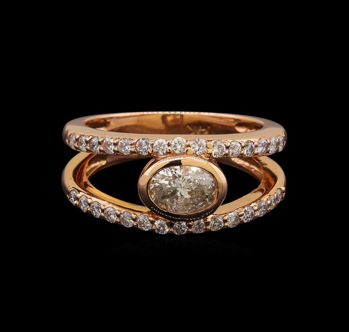 One electronically tested 14KT rose gold ladies cast diamond engagement ring with a bright polish finish. Identified with markings of "14K". Condition is new. Containing: One bezel set oval shaped cut diamond, measuring 6.50 x 5.00 x 3.50mm (depth est.) approximate weight of 0.72ct. Clarity: I-2. Color: J, Cut is Good. Thirty prong set round brilliant cut diamonds, measuring 1.30 - 1.30 x 0.78mm (depth est.) approximate total weight of 30 Stones = 0.24ct. Clarity: I-1 to I-2. Color: I - J, Cut is Good. All diamonds are graded in the mounting, unless otherwise stated. Total Weight of Diamonds 0.96ct. Total Weight of Engagement Ring 5.90 grams. GGL Appraised at $4,825.00.