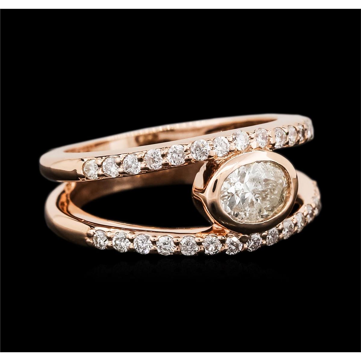 One electronically tested 14KT rose gold ladies cast diamond engagement ring with a bright polish finish. Identified with markings of "14K". Condition is new. Containing: One bezel set oval shaped cut diamond, measuring 6.50 x 5.00 x 3.50mm (depth est.) approximate weight of 0.72ct. Clarity: I-2. Color: J, Cut is Good. Thirty prong set round brilliant cut diamonds, measuring 1.30 - 1.30 x 0.78mm (depth est.) approximate total weight of 30 Stones = 0.24ct. Clarity: I-1 to I-2. Color: I - J, Cut is Good. All diamonds are graded in the mounting, unless otherwise stated. Total Weight of Diamonds 0.96ct. Total Weight of Engagement Ring 5.90 grams. GGL Appraised at $4,825.00.