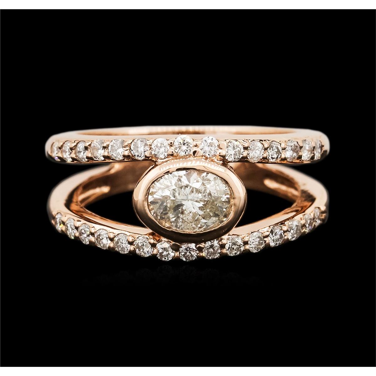 One electronically tested 14KT rose gold ladies cast diamond engagement ring with a bright polish finish. Identified with markings of "14K". Condition is new. Containing: One bezel set oval shaped cut diamond, measuring 6.50 x 5.00 x 3.50mm (depth est.) approximate weight of 0.72ct. Clarity: I-2. Color: J, Cut is Good. Thirty prong set round brilliant cut diamonds, measuring 1.30 - 1.30 x 0.78mm (depth est.) approximate total weight of 30 Stones = 0.24ct. Clarity: I-1 to I-2. Color: I - J, Cut is Good. All diamonds are graded in the mounting, unless otherwise stated. Total Weight of Diamonds 0.96ct. Total Weight of Engagement Ring 5.90 grams. GGL Appraised at $4,825.00.