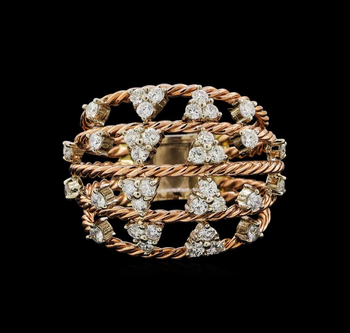One electronically tested 14KT rose gold ladies cast diamond ring with a bright polish finish. Identified with markings of "k14". Condition is new. Containing: Thirty-Six prong set round brilliant cut diamonds, measuring 2.00 - 2.00 x 1.20mm (depth est.) approximate total weight of 36 Stones = 1.00 ct. Clarity: SI-2 to I-1. Color: I - J, Cut is Good. Diamonds are graded in the mounting, unless otherwise stated. Total Weight of Diamonds 1.00 ct. Total Weight of Ring 7.80 grams.