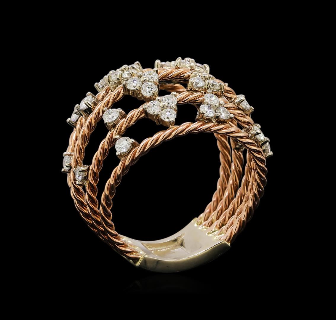 One electronically tested 14KT rose gold ladies cast diamond ring with a bright polish finish. Identified with markings of "k14". Condition is new. Containing: Thirty-Six prong set round brilliant cut diamonds, measuring 2.00 - 2.00 x 1.20mm (depth est.) approximate total weight of 36 Stones = 1.00 ct. Clarity: SI-2 to I-1. Color: I - J, Cut is Good. Diamonds are graded in the mounting, unless otherwise stated. Total Weight of Diamonds 1.00 ct. Total Weight of Ring 7.80 grams.