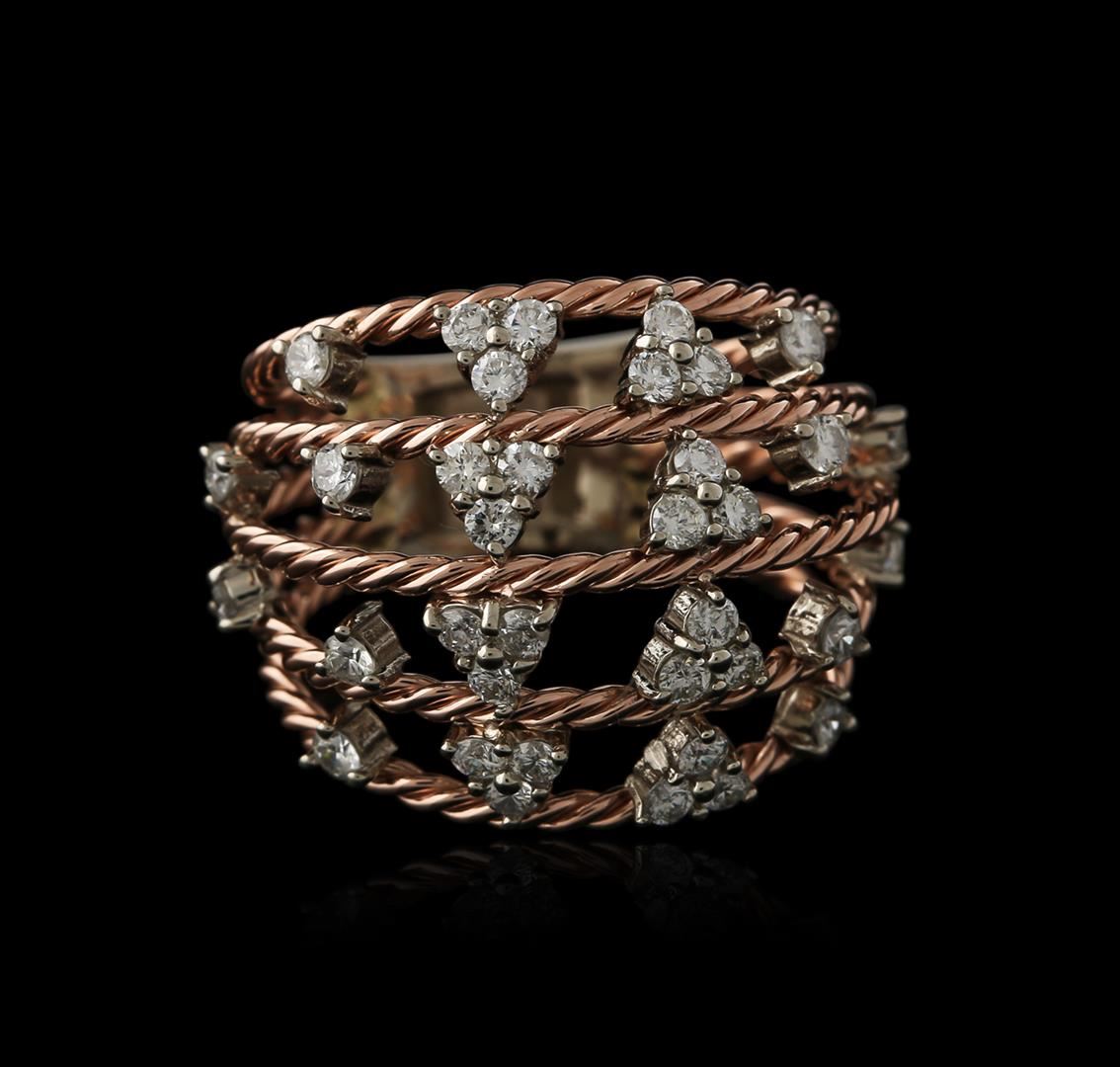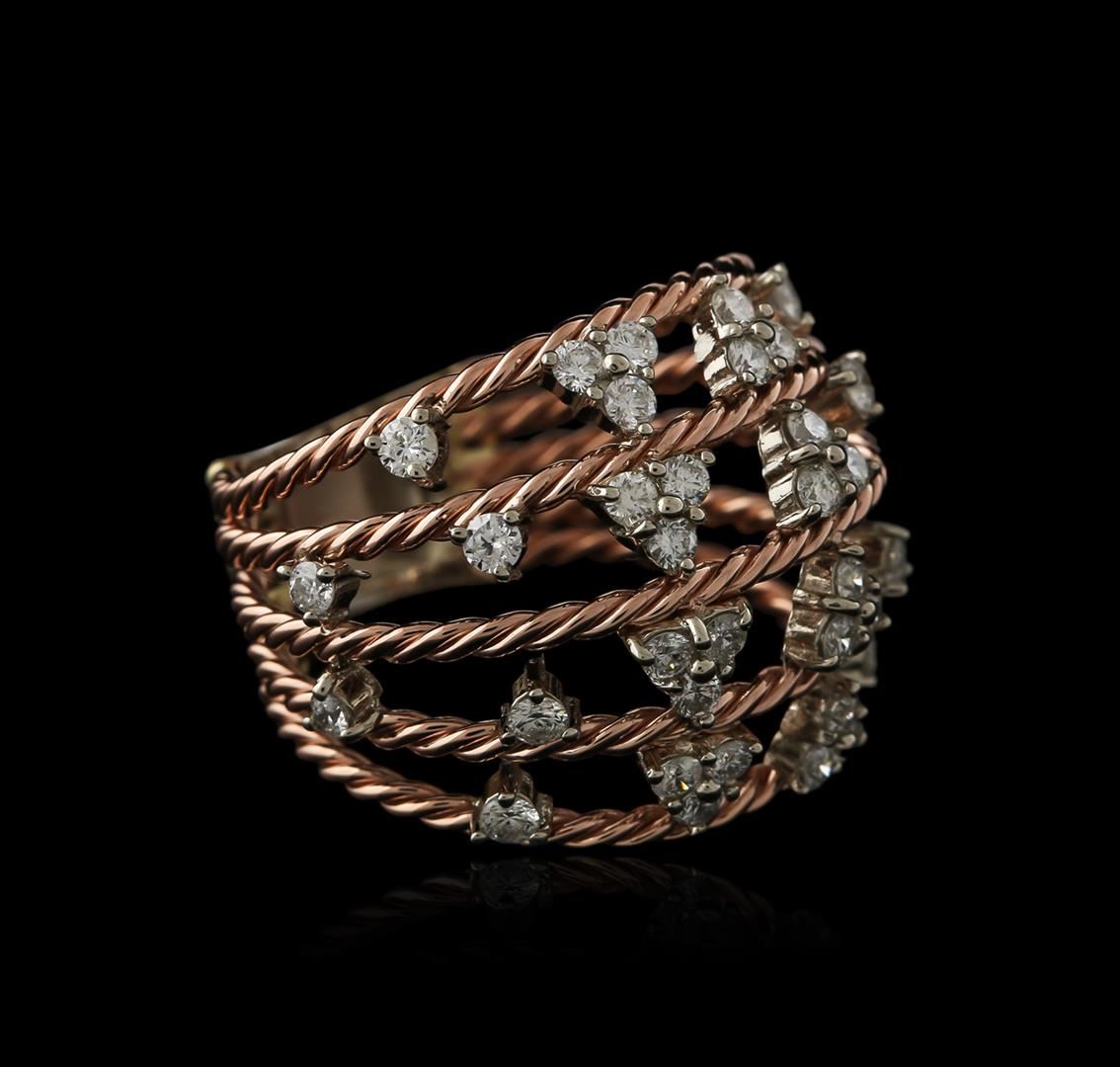 One electronically tested 14KT rose gold ladies cast diamond ring with a bright polish finish. Identified with markings of "k14". Condition is new. Containing: Thirty-Six prong set round brilliant cut diamonds, measuring 2.00 - 2.00 x 1.20mm (depth est.) approximate total weight of 36 Stones = 1.00ct. Clarity: SI-2 to I-1. Color: I - J, Cut is Good. Diamonds are graded in the mounting, unless otherwise stated. Total Weight of Diamonds 1.00ct. Total Weight of Ring 7.80 grams. GGL Appraised at $3,140.00.