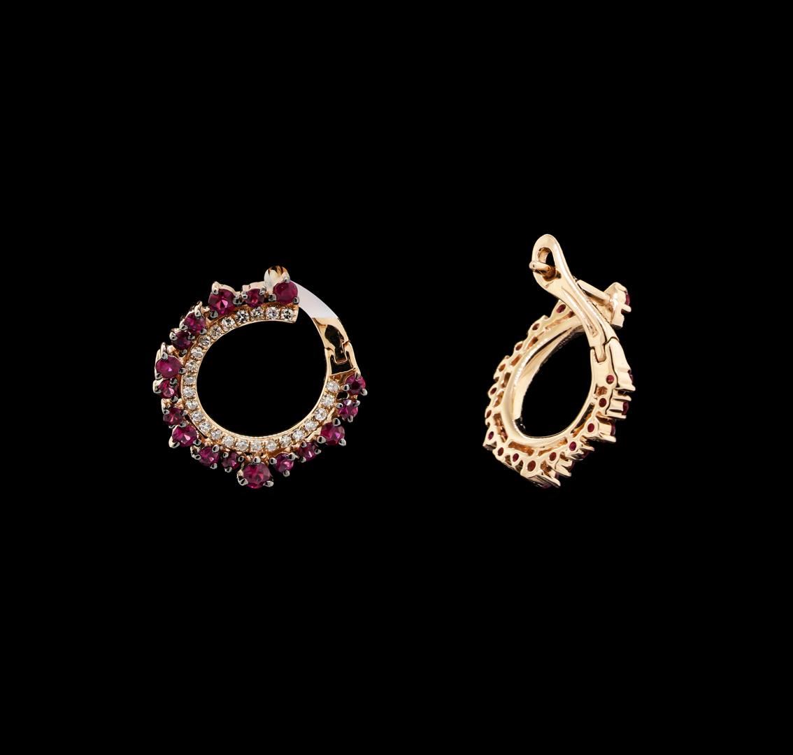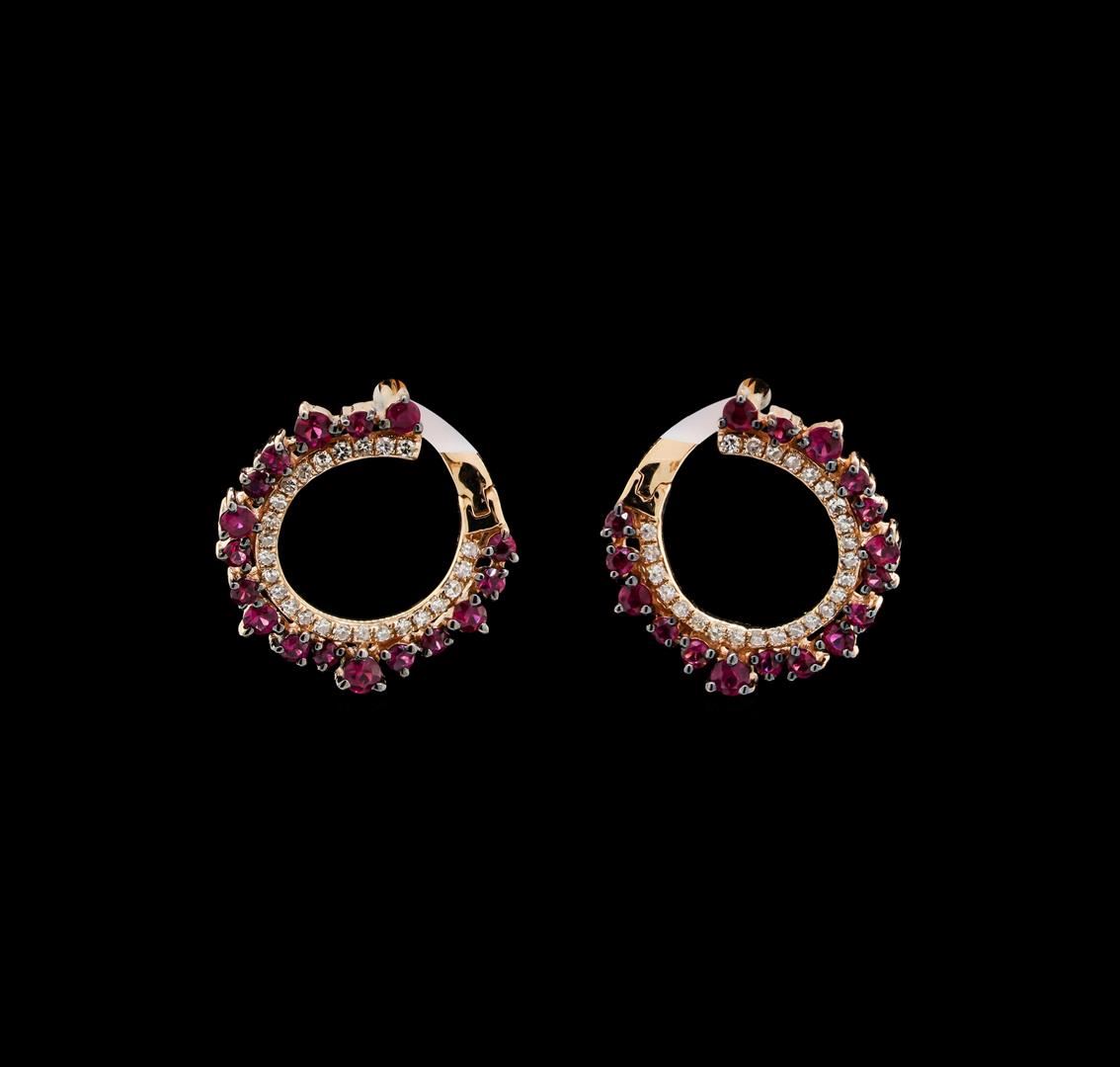 One pair of lady's earrings featuring: 14KT rose gold weighing 3.3 grams containing rubies weighing 1.00ctw and diamonds weighing 0.20ctw.