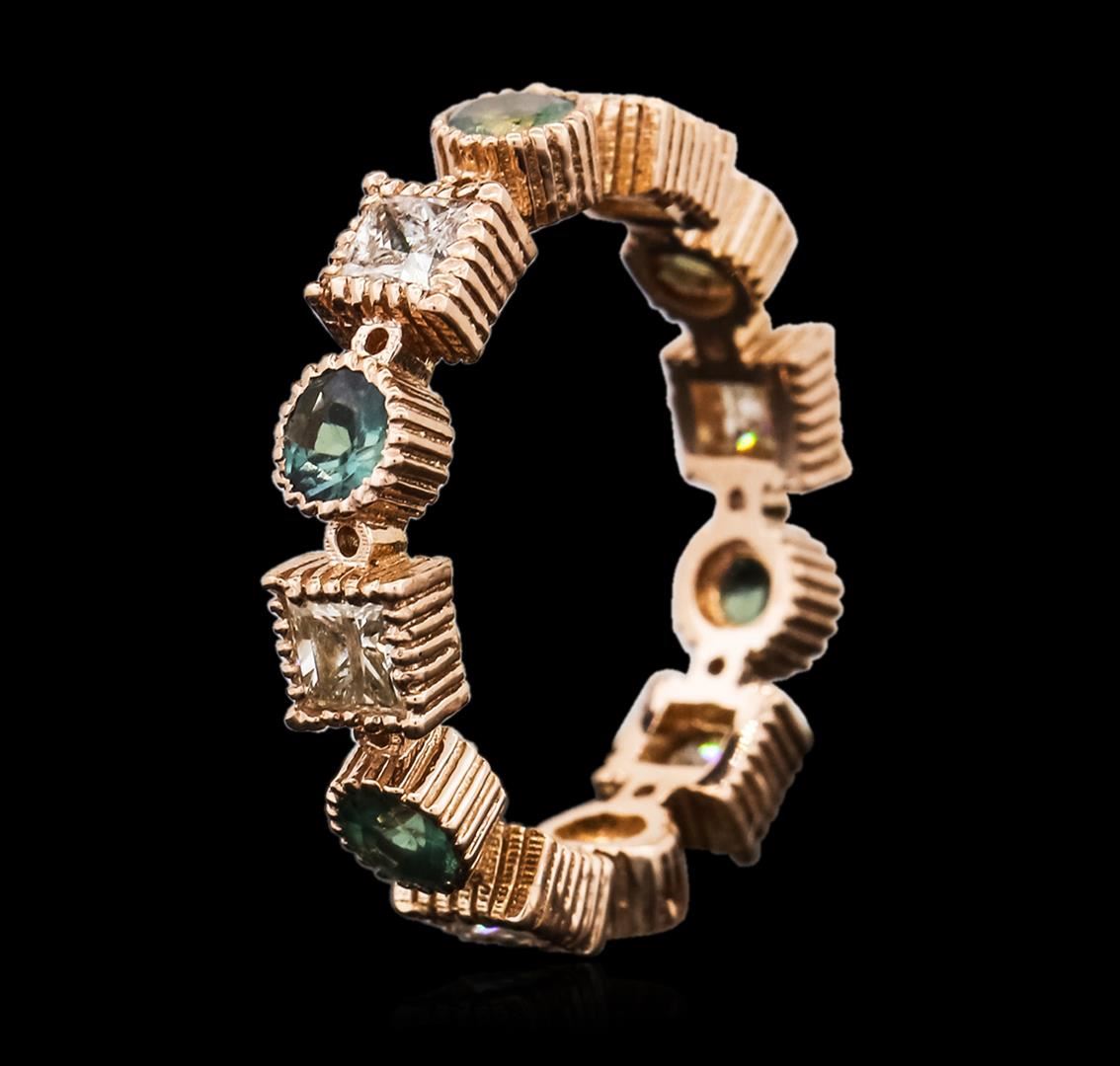 One electronically tested 14KT rose gold ladies cast green chrysoberyl and diamond ring. The ring features a continuous four millimeter wide green chrysoberyl and diamond ribbon. Bright polish finish with milgrain detailing. Condition is new, good workmanship. Containing: Six bezel set round brilliant cut natural green chrysoberyls, measuring 3.30 - 3.20 x 2.11 mm, approximate total weight of 1.02ct., clarity is slightly included, medium dark, very slightly grayish, very slightly bluish green color, (GIA vslbG 6/3), cut is good. Transmitting light with a minimum of distortion, transparent. Naturally occurring internal & external characteristics are present. Color grade is an average for the group. Graded in the setting. Six bezel set princess cut diamonds, measuring 3.30 x 3.10 x 2.00mm (depth est.) approximate total weight of 6 Stones = 1.10ct. Graded in the setting. Clarity: I-1 to I-2. Color: G - I. Total Weight of Colored Stones 1.02ct. Total Weight of Diamonds 1.10ct. Total Weight of Ring 2.96 grams. AIG Appraised at $2,540.00.