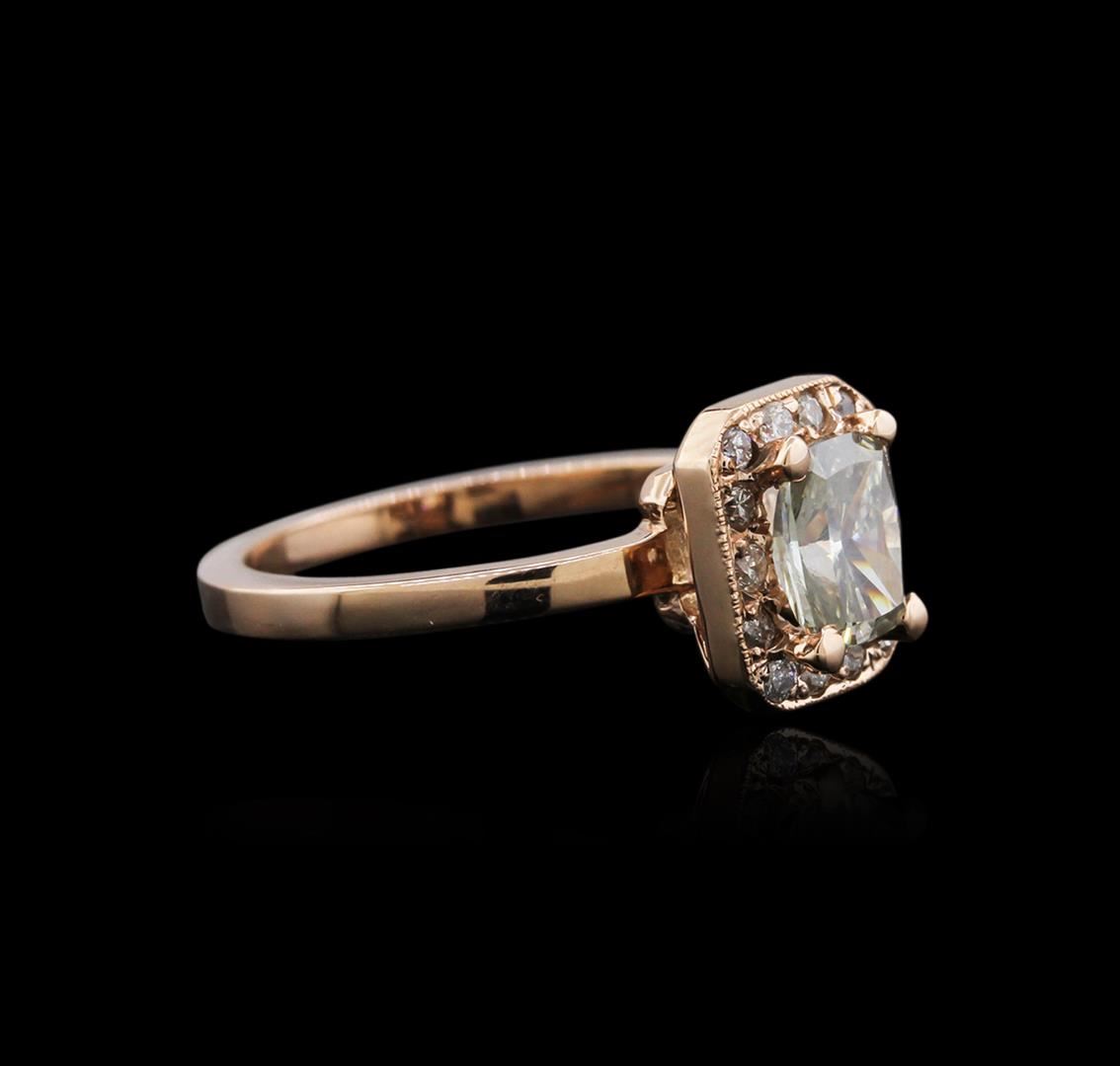 One electronically tested 14KT rose gold ladies cast diamond ring with a bright polish finish. Identified with markings of "14K". Condition is new. Containing: One prong set cushion cut diamond, measuring 6.66 x 5.15 x 3.19mm (depth est.) approximate weight of 0.93ct. Clarity: SI-2, color of Fancy Light Green, Cut is Good. Whether the color of this diamond is of natural origin or an artificial process cannot currently be determined. Fourteen prong set round brilliant cut diamonds, measuring 1.30 - 1.30 x 0.78mm (depth est.) approximate total weight of 14 Stones = 0.11ct. Clarity: SI-2 to I-2. Color: J - K, Cut is Good. All diamonds are graded in the mounting, unless otherwise stated. Total Weight of Diamonds 1.04ct. Total Weight of Ring 3.80 grams. GGL Appraised at $5,370.00.