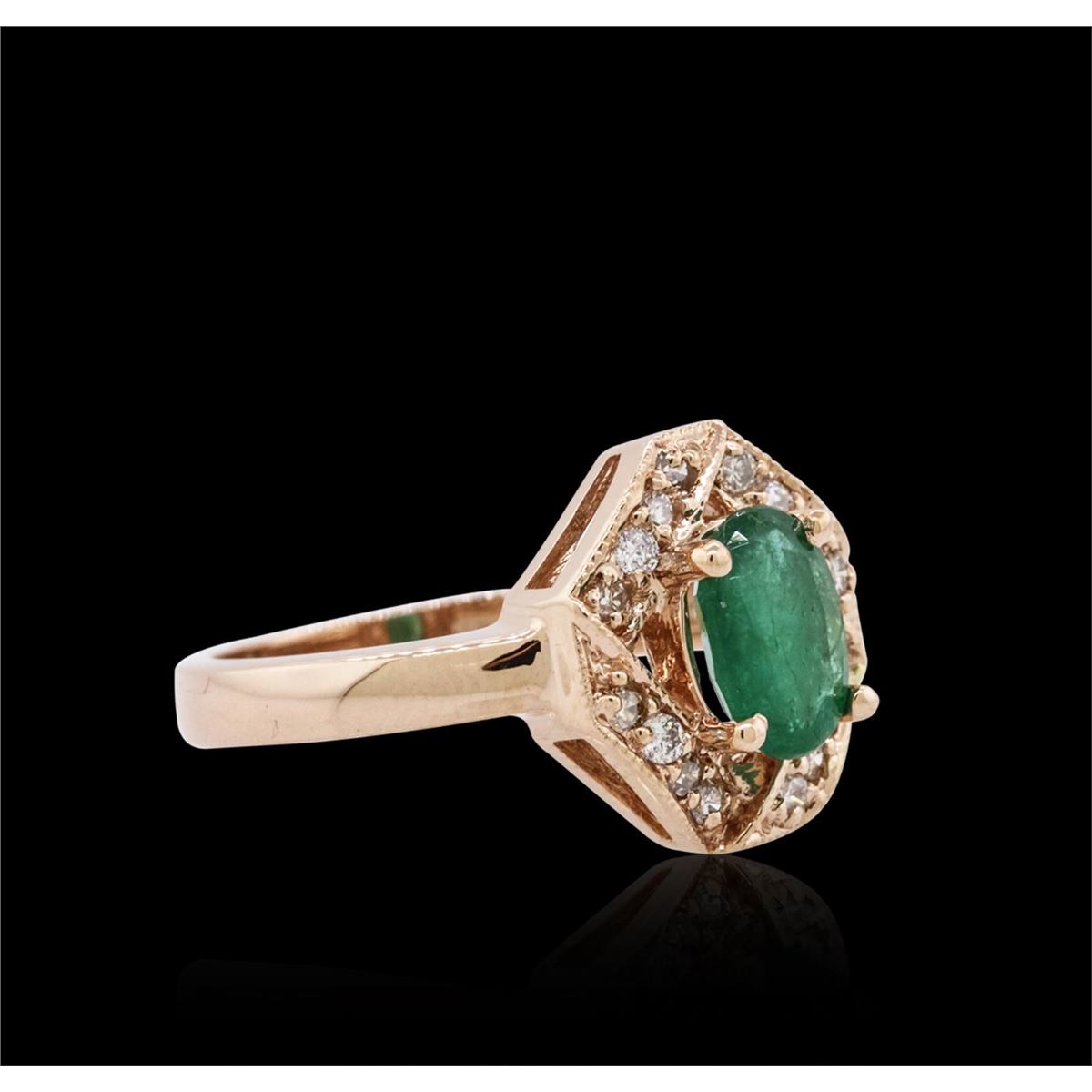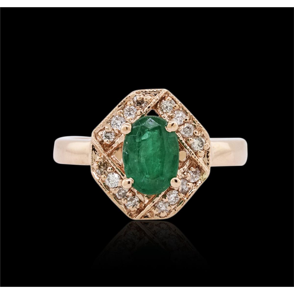 One ring featuring: 14KT rose gold weighing 4.60 grams containing one prong set oval cut emerald with a total weight of 1.06ct and pave set round cut diamonds with a total weight of 0.30cts.