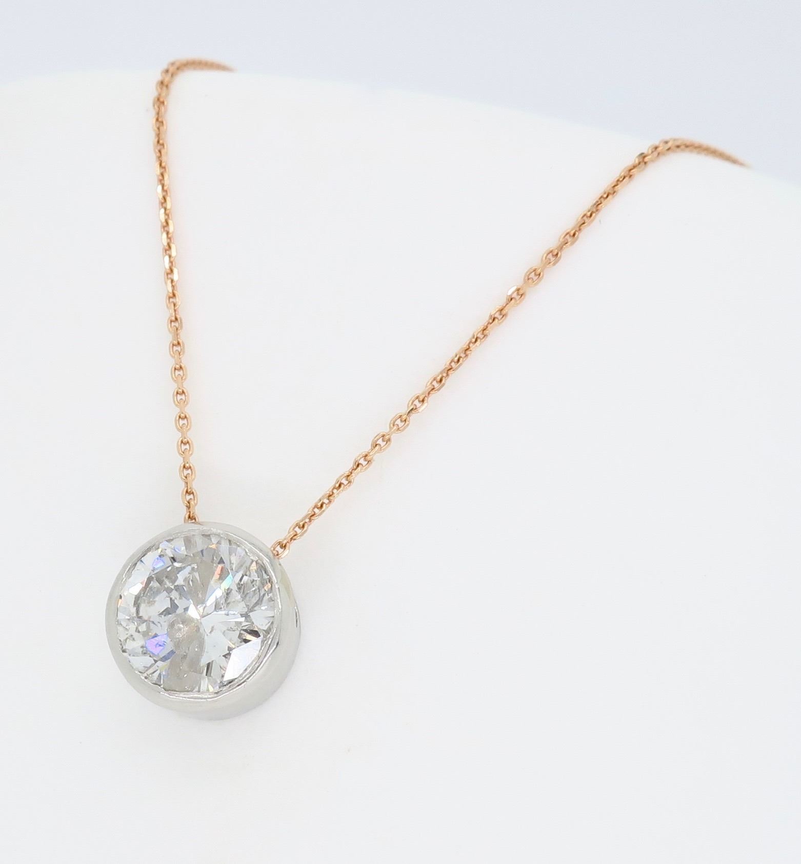 One 14KT Rose Gold 1.12ct Diamond Pendant with Chain. (1) Round Diamond with a total weight of 1.12cts with a color of I-J and clarity of I-1. Total weight of this pendant is 1.9 grams. Total length of this chain is 16 inches.