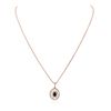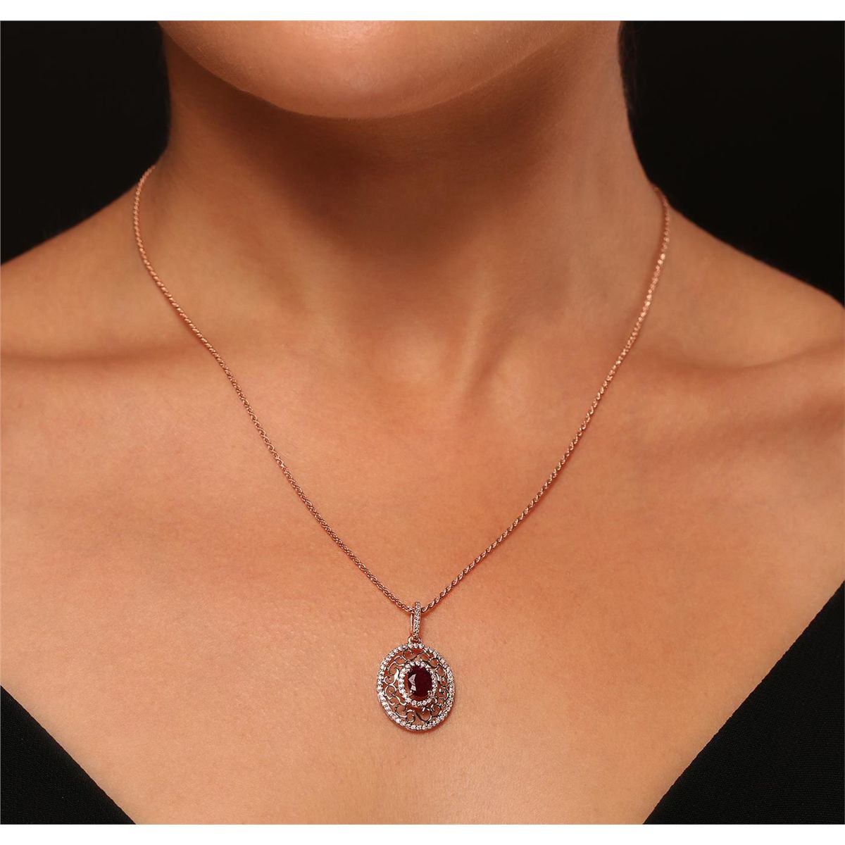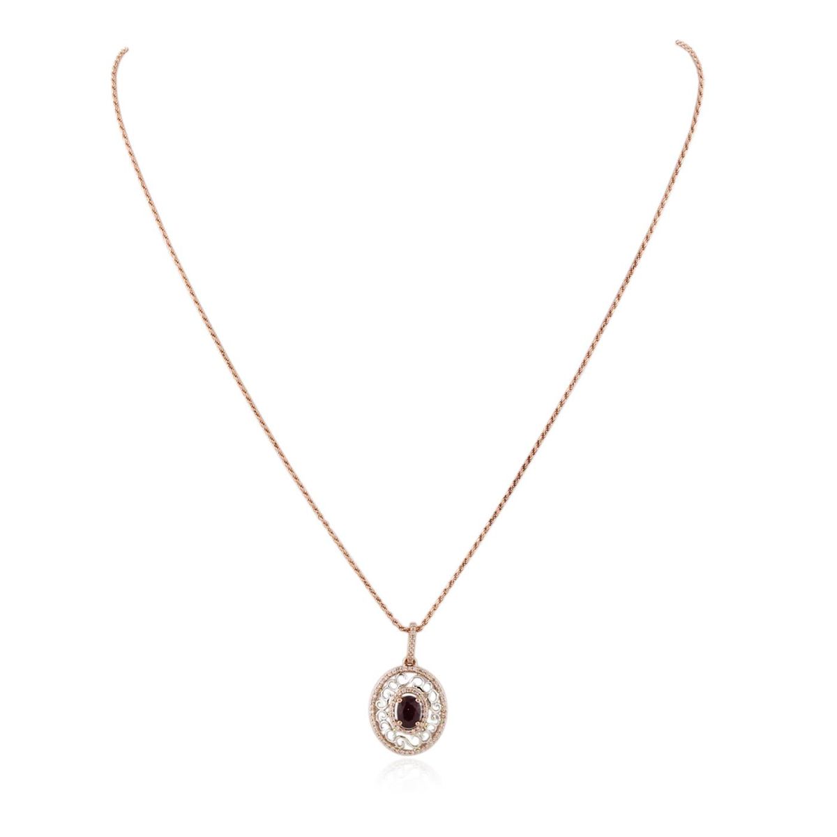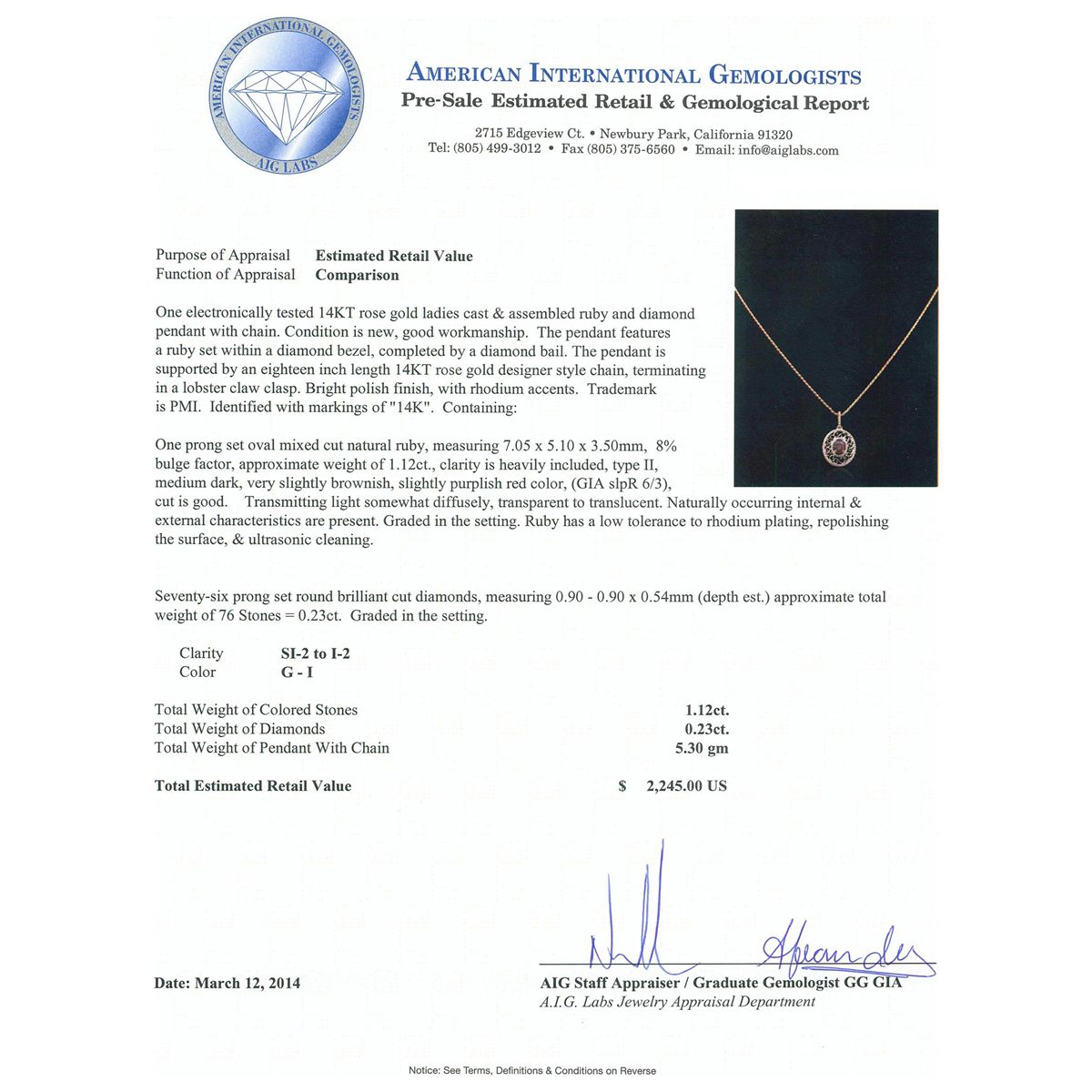 One electronically tested 14KT rose gold ladies cast & assembled ruby and diamond pendant with chain. Condition is new, good workmanship. The pendant features a ruby set within a diamond bezel, completed by a diamond bail. The pendant is supported by an eighteen inch length 14KT rose gold designer style chain, terminating in a lobster claw clasp. Bright polish finish, with rhodium accents. Trademark is PMI. Identified with markings of "14K". Containing: One prong set oval mixed cut natural ruby, measuring 7.05 x 5.10 x 3.50mm, 8%. bulge factor, approximate weight of 1.12ct., clarity is heavily included, type II, medium dark, very slightly brownish, slightly purplish red color, (GIA slpR 6/3), cut is good. Transmitting light somewhat diffusely, transparent to translucent. Naturally occurring internal & external characteristics are present. Graded in the setting. Ruby has a low tolerance to rhodium plating, repolishing the surface, & ultrasonic cleaning. Seventy-Six prong set round brilliant cut diamonds, measuring 0.90 - 0.90 x 0.54mm (depth est.) approximate. Total Weight of 76 Stones = 0.23ct. Graded in the setting. Clarity: SI-2 to I-2. Color: G - I. Total Weight of Colored Stones 1.12ct. Total Weight of Diamonds 0.23ct. Total Weight of Pendant With Chain 5.30 grams. AIG Appraised at $2,245.00.