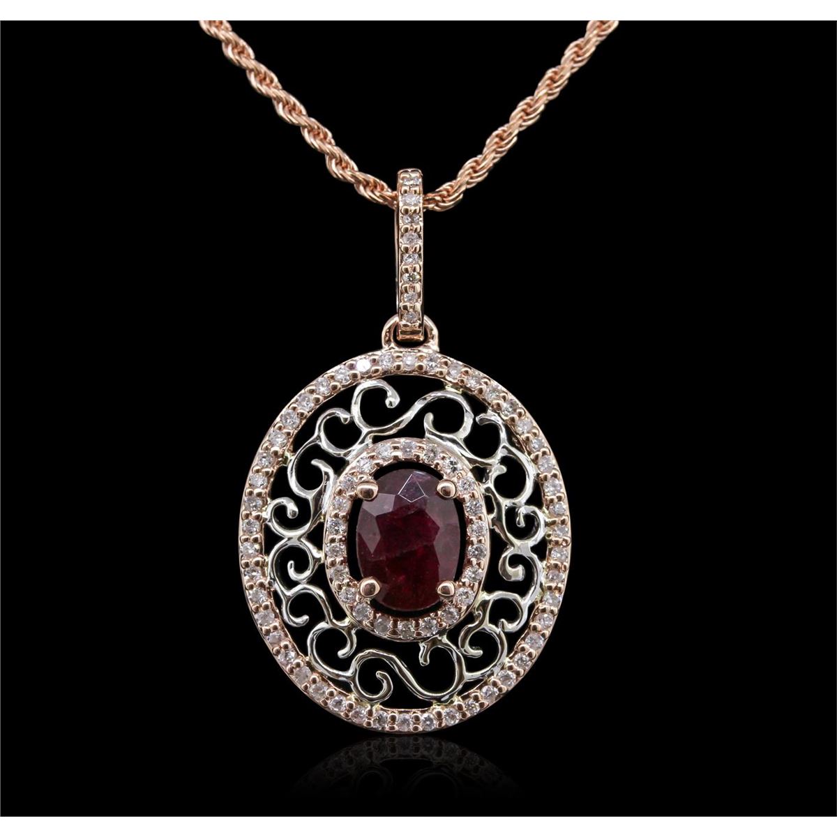 One electronically tested 14KT rose gold ladies cast & assembled ruby and diamond pendant with chain. Condition is new, good workmanship. The pendant features a ruby set within a diamond bezel, completed by a diamond bail. The pendant is supported by an eighteen inch length 14KT rose gold designer style chain, terminating in a lobster claw clasp. Bright polish finish, with rhodium accents. Trademark is PMI. Identified with markings of "14K". Containing: One prong set oval mixed cut natural ruby, measuring 7.05 x 5.10 x 3.50mm, 8%. bulge factor, approximate weight of 1.12ct., clarity is heavily included, type II, medium dark, very slightly brownish, slightly purplish red color, (GIA slpR 6/3), cut is good. Transmitting light somewhat diffusely, transparent to translucent. Naturally occurring internal & external characteristics are present. Graded in the setting. Ruby has a low tolerance to rhodium plating, repolishing the surface, & ultrasonic cleaning. Seventy-Six prong set round brilliant cut diamonds, measuring 0.90 - 0.90 x 0.54mm (depth est.) approximate. Total Weight of 76 Stones = 0.23ct. Graded in the setting. Clarity: SI-2 to I-2. Color: G - I. Total Weight of Colored Stones 1.12ct. Total Weight of Diamonds 0.23ct. Total Weight of Pendant With Chain 5.30 grams. AIG Appraised at $2,245.00.