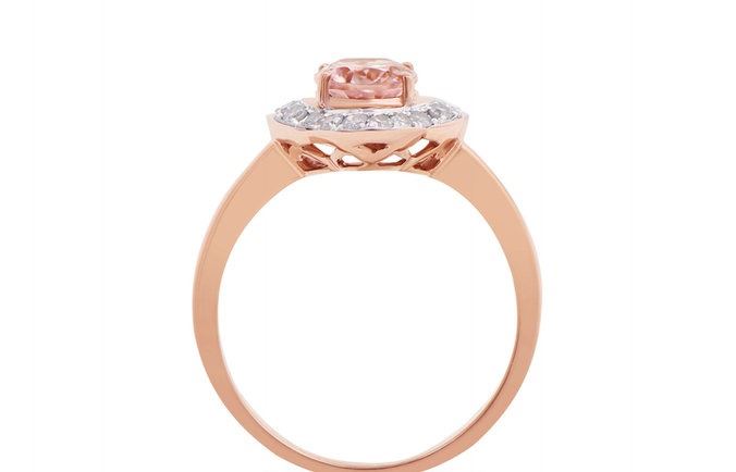 Morganite Color: Peach-Pink Shape: Oval Size: 8x6 Quantity: 1 CTW: 1.14 Diamond Description Shape: Rounds Size: 1.5mm Quantity: 18 CTW: 0.31 Grade: I1-I2 Color: H-I. Total Weight: 2.85 grams. Ring Size: 7.5.