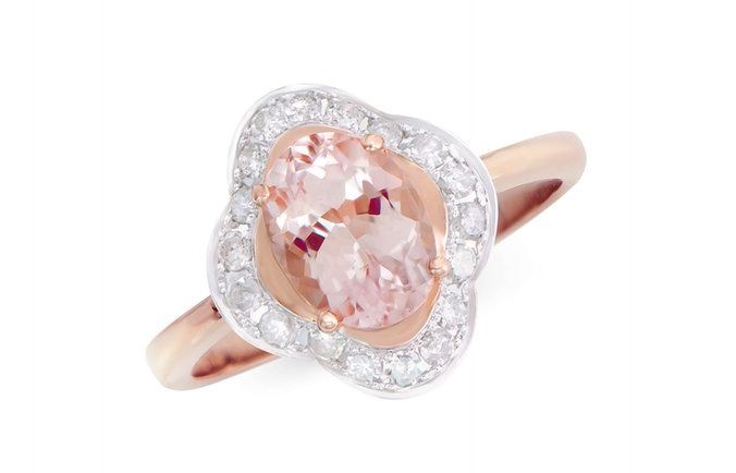 Morganite Color: Peach-Pink Shape: Oval Size: 8x6 Quantity: 1 CTW: 1.14 Diamond Description Shape: Rounds Size: 1.5mm Quantity: 18 CTW: 0.31 Grade: I1-I2 Color: H-I. Total Weight: 2.85 grams. Ring Size: 7.5.