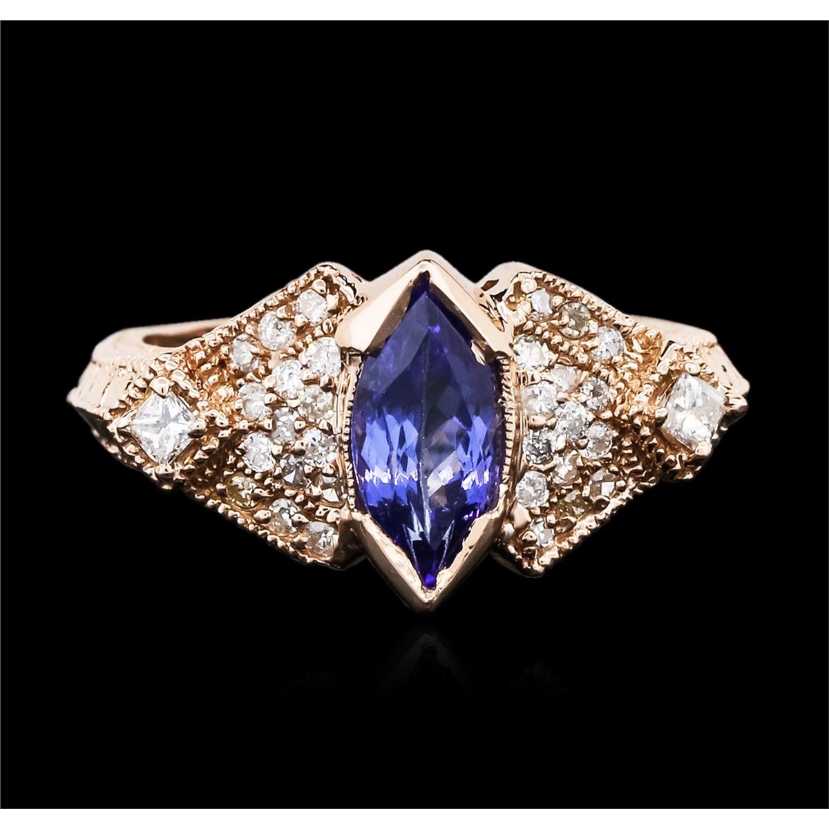 One ring featuring: 14KT rose gold weighing 5.87 grams containing one tanzanite center stone with a total weight of 1.18ct and princess cut/round diamonds with a total weight of 0.33cts.