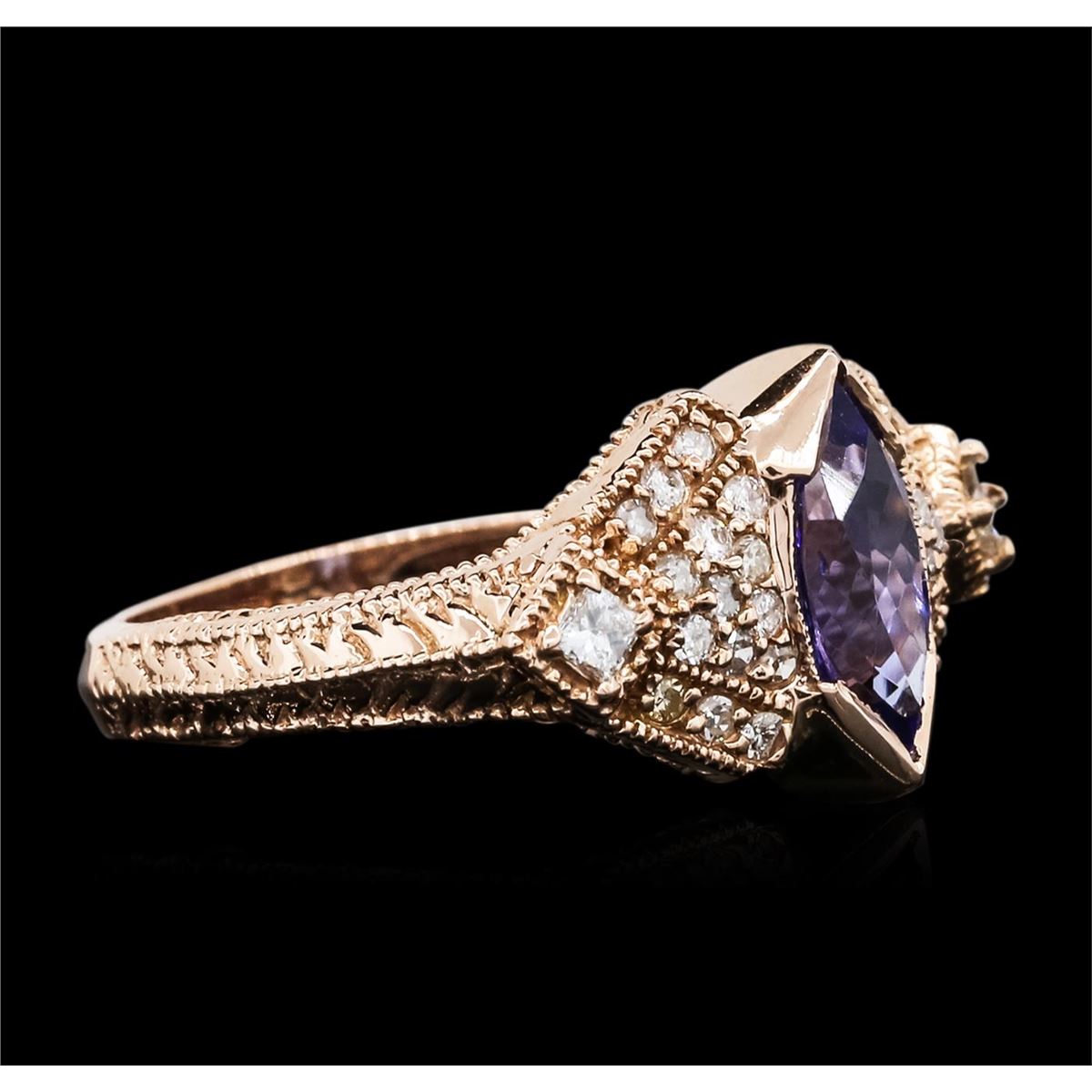 One ring featuring: 14KT rose gold weighing 5.87 grams containing one tanzanite center stone with a total weight of 1.18ct and princess cut/round diamonds with a total weight of 0.33cts.