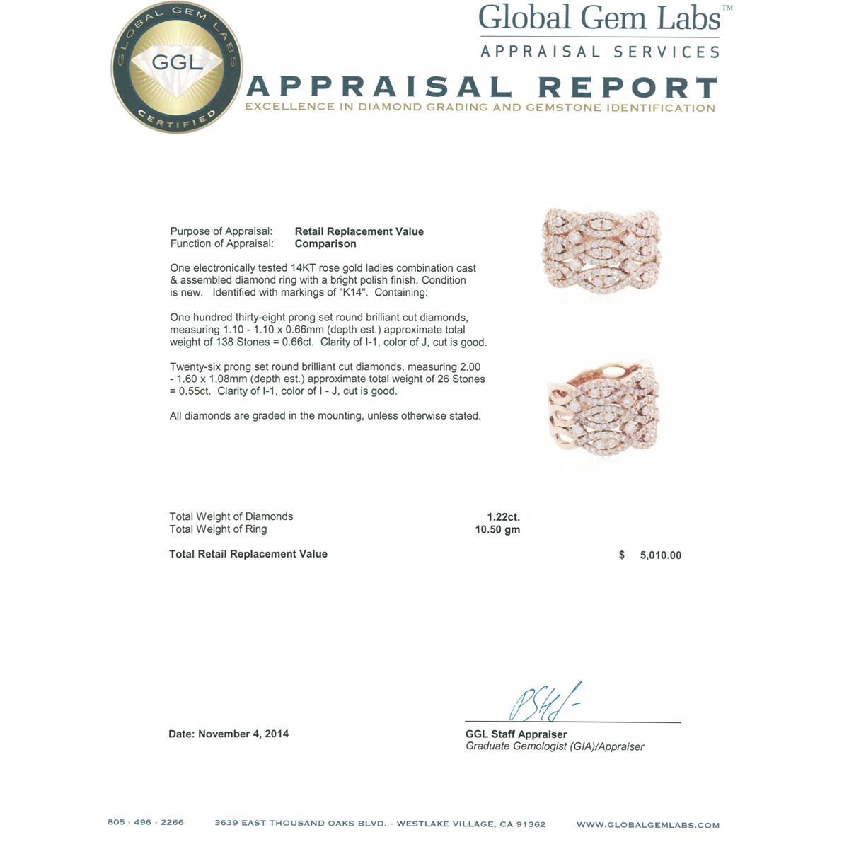 One electronically tested 14KT rose gold ladies combination cast & assembled diamond ring with a bright polish finish. Identified with markings of "K14". Condition is new. Containing: One Hundred Thirty-Eight prong set round brilliant cut diamonds, measuring 1.10 - 1.10 x 0.66mm (depth est.) approximate total weight of 138 Stones = 0.66ct. Clarity: I-1. Color: J, Cut is Good. Twenty-Six prong set round brilliant cut diamonds, measuring 2.00 - 1.60 x 1.08mm (depth est.) approximate total weight of 26 Stones = 0.55ct. Clarity: I-1. Color: I - J, Cut is Good. All diamonds are graded in the mounting, unless otherwise stated. Total Weight of Diamonds 1.22ct. Total Weight of Ring 10.50 grams. GGL Appraised at $5,010.00.